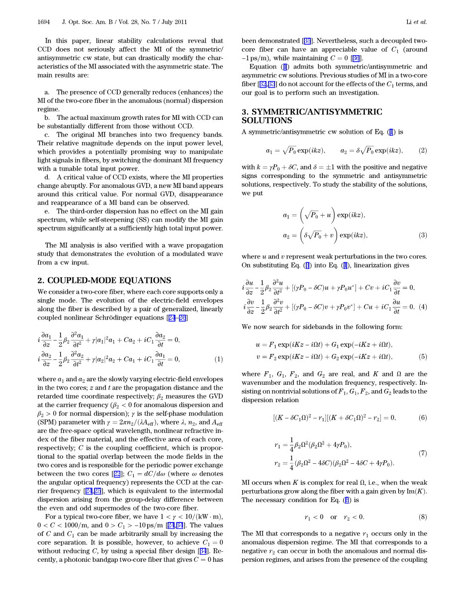 等式(1)存在对称反对称和不对称三种平面波的解。之前研究的双核光纤的调制不稳定性是不考虑的影响的。我们的目标正是完成一个这样的研究。