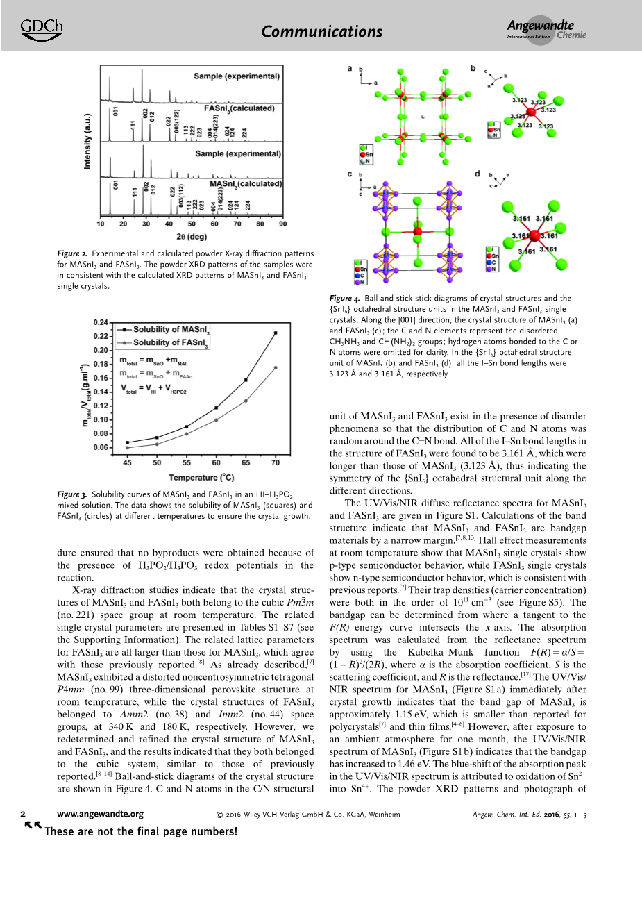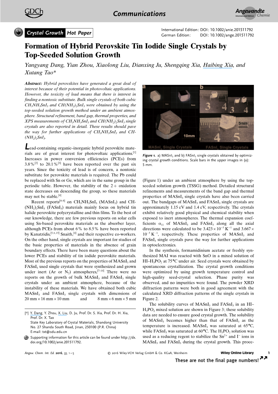 据最近的报告[4–8]可知,CH3NH3SnI3 (MASnI3) 和 CH (NH2)2SnI3 (FASnI3) 材料主要集中在混合锡卤化物钙钛矿多晶和薄膜领域。据我们所知, 以前很少有关于太阳能电池使用 Sn (锡)基钙钛矿材料作为吸收层的报告, 尽管据Kanatzidis[56、15] 、Snaith[4]和它们的同事报导,Sn (锡)基钙钛矿材料作为吸收层可以使转换效率(PCEs) 从大约6% 上升到8.5% 。另一方面, 单晶在缺乏晶界效应的情况下对材料基本性质的研究具有重要意义。现在对于碘化钾钙钛矿材料的PCEs和稳定性还有许多问题。以前关于 MASnI3和 FASnI3的性质的大多数报告都使用了在惰性气体环境下 (Ar 或 N2) 中合成和生长的单晶[7–14],没有关于批量增长的报告MASnI3和 FASnI3在空气环境下的单晶, 因为这些材料不稳定。我们已经获得了立方 MASnI3和 FASnI3单晶的尺寸为:长宽高20mm ,16mm ,10mm和 8mm ,6mm ,5mm。