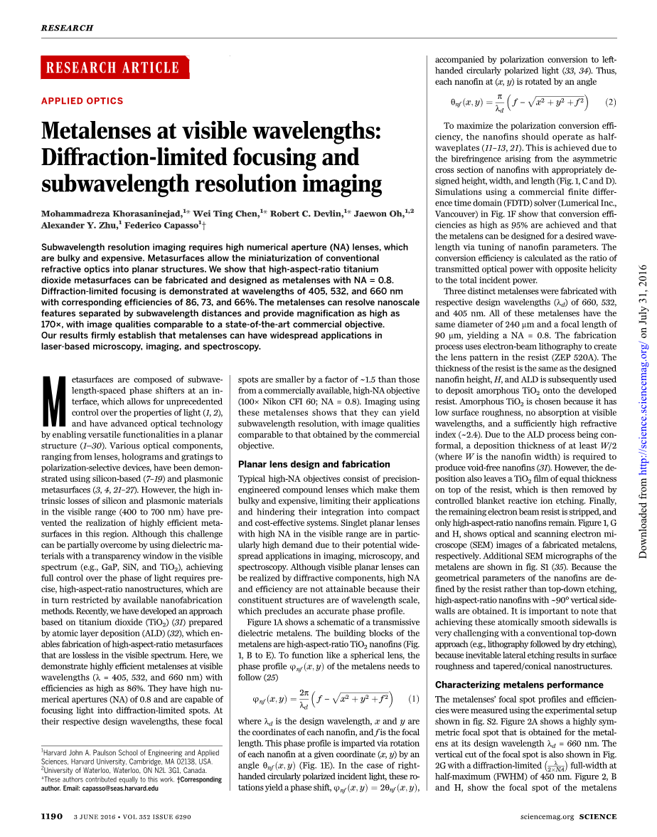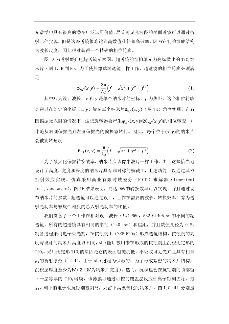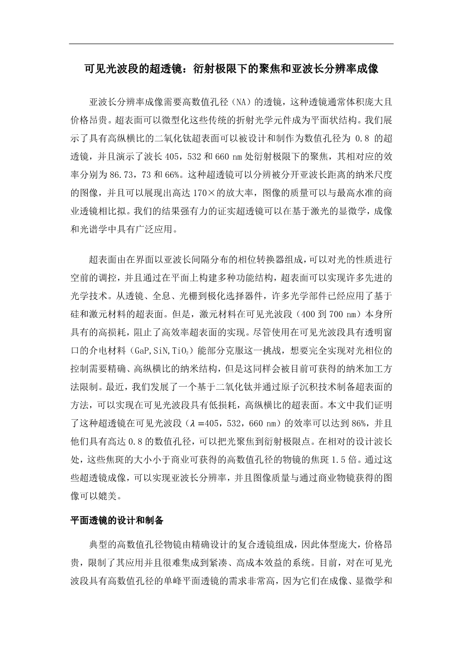 可见光波段的超透镜:衍射极限下的聚焦和亚波长分辨率成像外文翻译资料