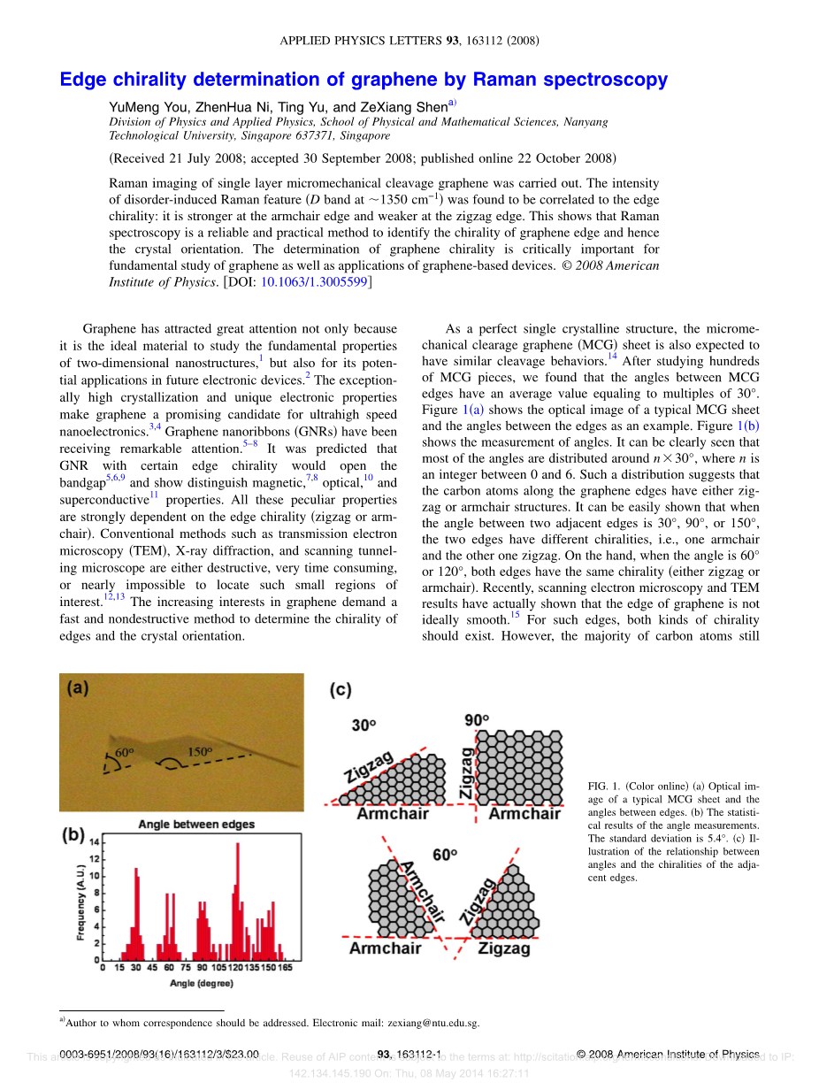 作为一种完美的单晶结构,石墨烯的微观机械间隙(MCG)薄板也有类似的解理方式。在研究了数百个MCG碎片后,我们发现MCG边缘之间的夹角平均值等于30°的倍数。图1(a)以典型MCG片的光学图像为例,给出了边缘间的夹角。图1(b)显示角度的测量。可以清楚地看到,大部分的角度分布在ntimes;30度,其中n是0到6之间的整数。这种分布表明石墨烯边缘的碳原子要么是锯齿状结构,要么是扶手椅型结构。可以很容易地表明,当两个相邻边缘之间的角度为30°、90°或150°时,两个边缘具有不同的手性,即一个扶手椅型和另一个锯齿形。另一方面,当角度为60°或120°时,两个边具有相同的手性(锯齿形或扶手椅型)。近年来,扫描电镜和透射电镜的研究表明,石墨烯的边缘并不理想光滑。对于这样的边缘,两种手性都应该存在。然而,大多数碳原子仍然和光滑的一样。因此,边缘的角度和手性应该是微观平均效应的结果,因为沿边缘的大多数碳原子是以一种不同于另一种的手性排列的。因此,我们在这项工作中提到的手性是统计数据的平均值。