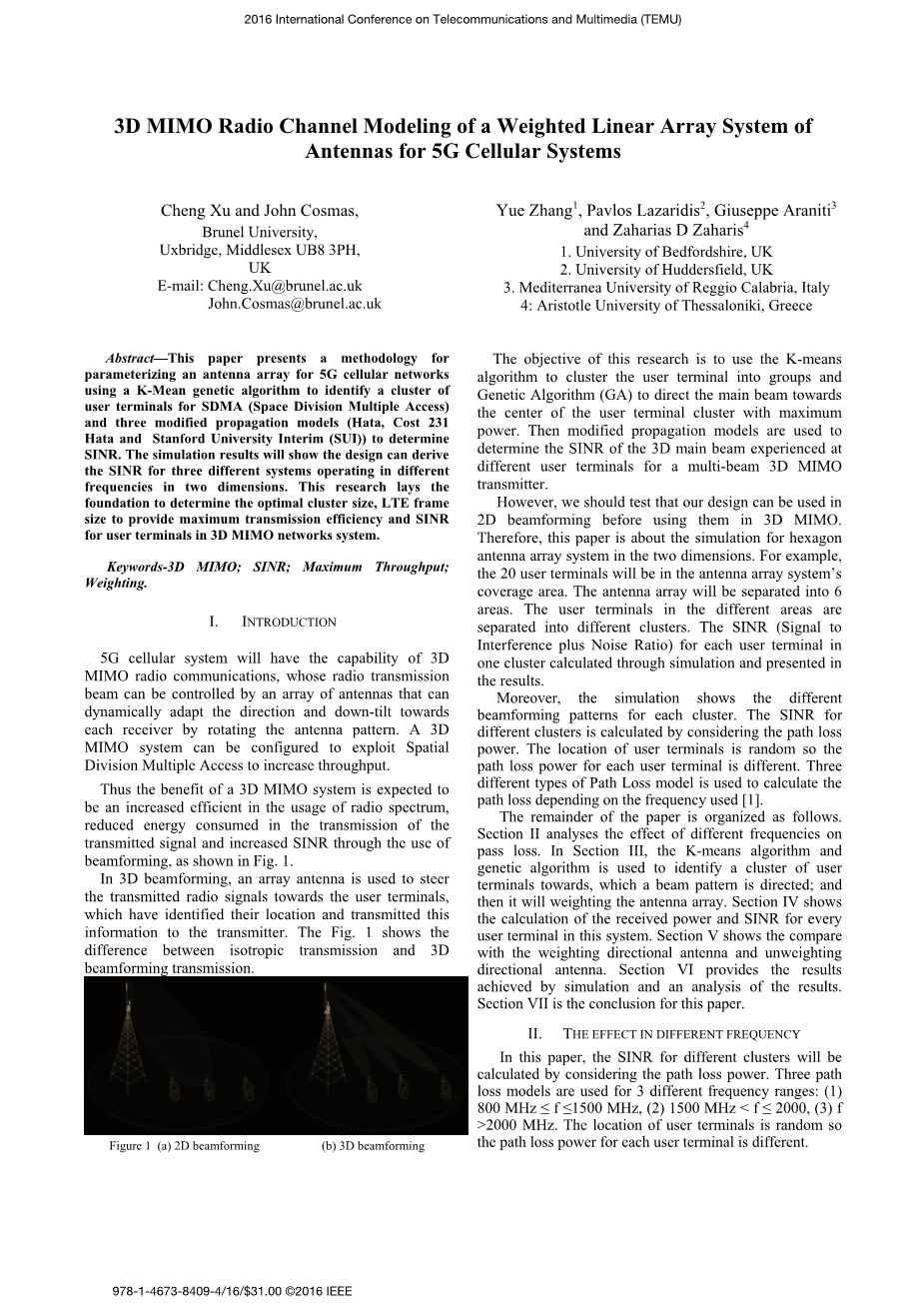 用于5G蜂窝系统的天线加权线性阵列系统的3D MIMO无线电信道建模