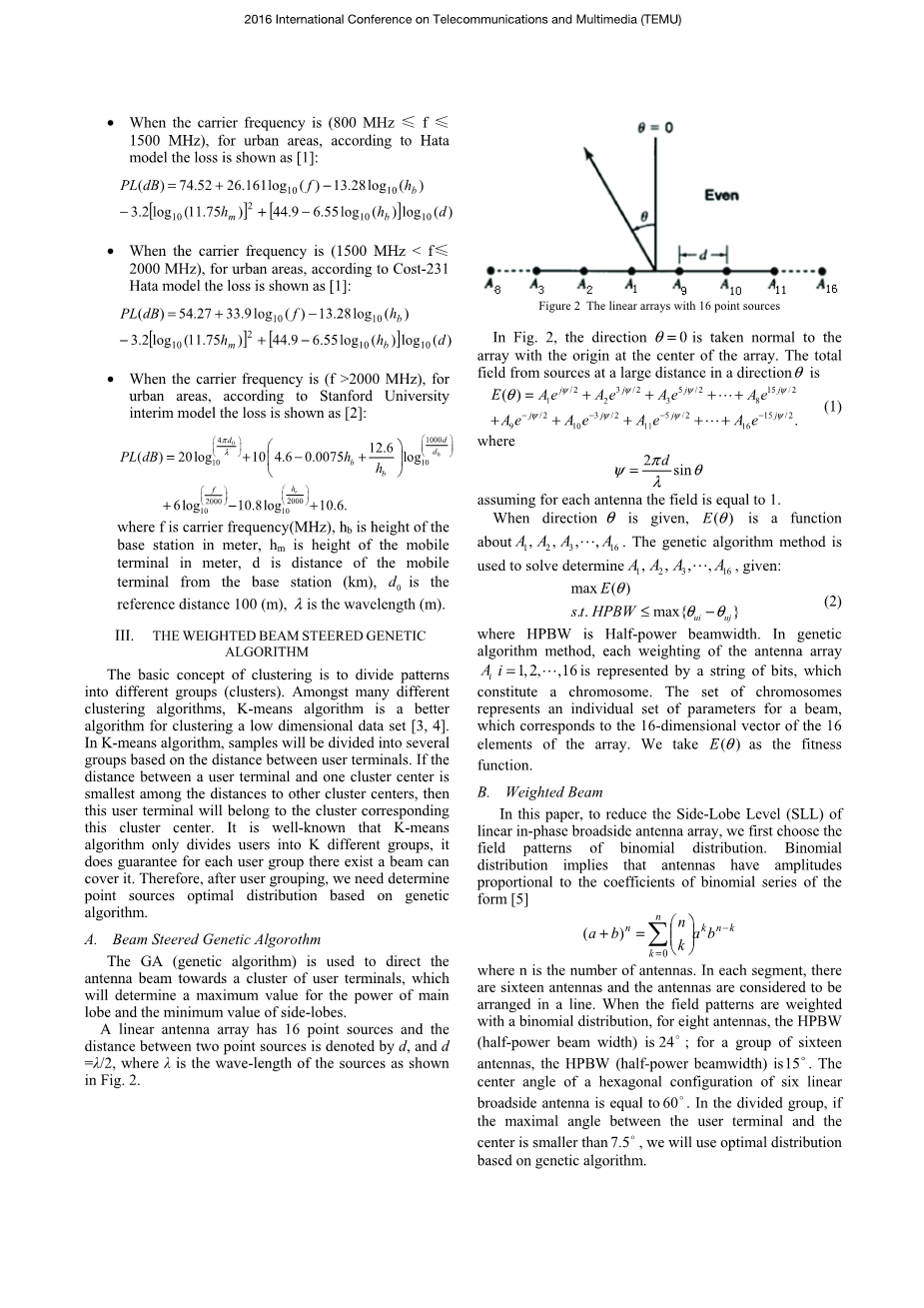 论文的其余部分组织如下。在第二节中分析了不同频率对插入损耗损的影响。在第三节中,我们使用K均值算法和遗传算法来识别一组用户终端,并对其进行波束图定向,然后对天线阵列进行加权。在第四节中我们给出了该系统中每个用户终端的接收功率和SINR的计算。在第五节中我们给出了与加权定向天线和非加权定向天线的比较。在第六节中提供了仿真所取得的结果,并对结果进行了分析。第七节是本文的结论。