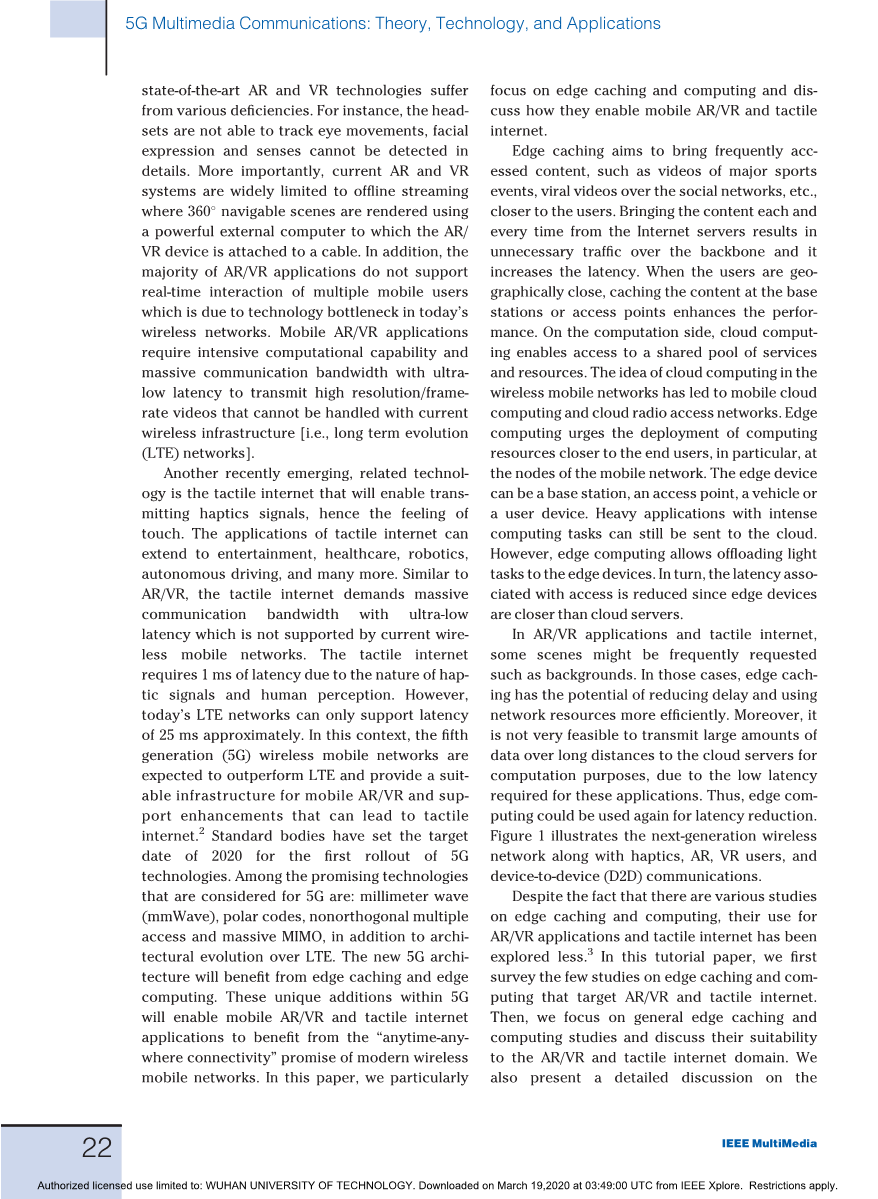另一项最近出现的相关技术是触觉互联网,它可以传递触觉信号,从而产生触觉。触觉互联网的应用可以扩展到娱乐、医疗、机器人、自动驾驶等领域。与AR/VR类似,触觉互联网需要大量的通信带宽和超低延迟,这是目前的无线移动网络所不支持的。触觉互联网由于触觉信号和人类感知的特性,需要1毫秒的延迟。然而,目前的LTE网络只能支持大约25毫秒的延迟。在这方面,第五代(5G)无线移动网络有望超越LTE,为移动AR/VR提供合适的基础设施,并增强支持,实现触觉互联网。标准机构已经为首次推出5G技术设定了2020年的目标日期。除了在LTE上进行架构上的改进外,5G考虑的前沿技术包括:毫米波(mmWave)、极性码、非正交多址和大规模MIMO。新的5G架构将受益于边缘缓存和边缘计算。5G中这些独特的附加功能将使移动AR/VR和触觉互联网应用受益于现代无线移动网络“随时随地连接”的承诺。在这篇论文中,我们特别关注边缘缓存和计算,并讨论它们如何支持移动AR/VR和触觉互联网。