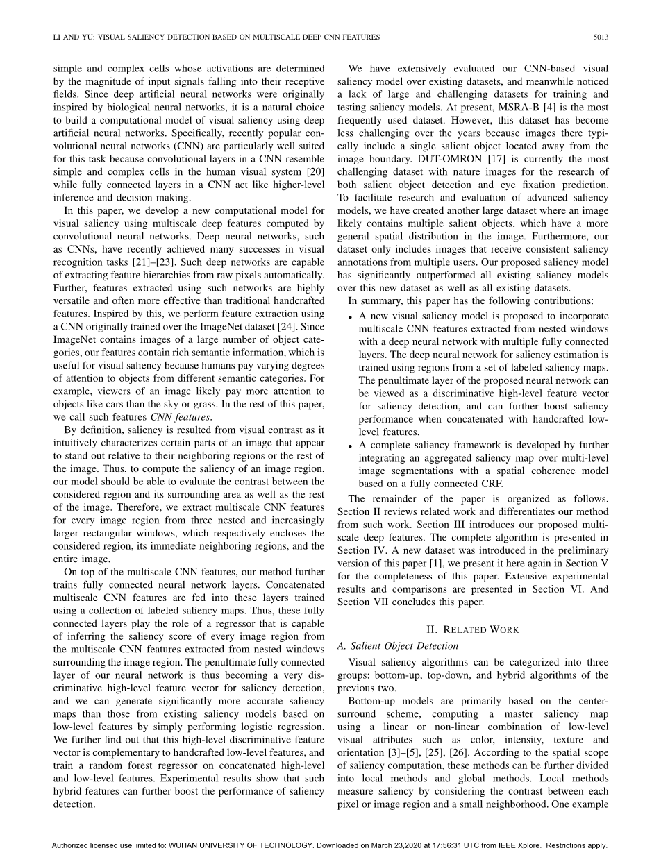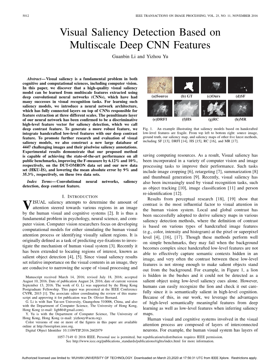 索引:卷积神经网络,显著性检测,深对比度特征。
