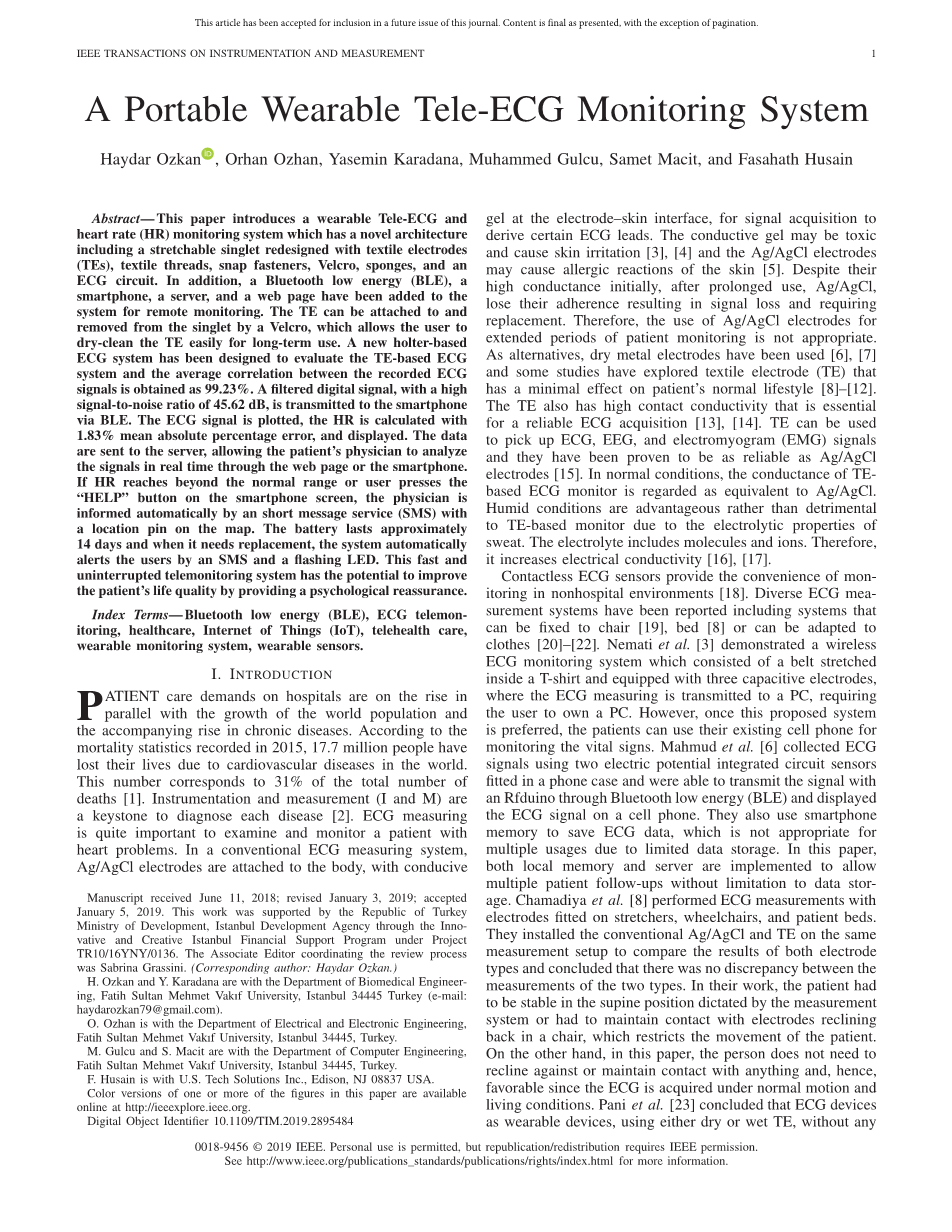 摘要:本文介绍了一种新型的可穿戴心电心率监测系统,该系统采用可伸缩汗衫结构,包括纺织电极(TEs)、纺织螺纹、扣件、尼龙搭扣、海绵和心电电路。此外,系统还增加了蓝牙低功耗(BLE)技术、智能手机、服务器和web页面进行远程监控。纺织电极可以用尼龙搭扣连接在汗衫上,也可以用尼龙搭扣从汗衫上取下,这样用户就可以方便地干洗纺织电极,以便长期使用。本文设计了一种新的基于动态心电图技术的心电系统,与基于纺织电极的心电系统进行了(对比)评价,得到了记录的心电信号之间的平均相关性为99.23%。滤波后的数字信号通过低功耗蓝牙传输至智能手机,其信噪比高达45.62dB。将心电信号作图,计算出心率的平均绝对百分误差为1.83%,并显示出来。数据被发送到服务器,让病人的医生通过网页或智能手机实时分析这些信号。如果心率超出了正常范围,或者用户按下智能手机屏幕上的“帮助”按钮,医生就会通过短信息服务(SMS)自动获得患者地理位置。该系统的电池可使用约14天,当需要更换电池时,系统会通过短信和闪烁的LED灯自动提醒用户。这种快速、不间断的远程监护系统很有可能通过提供心理安慰来改善患者的生活质量。