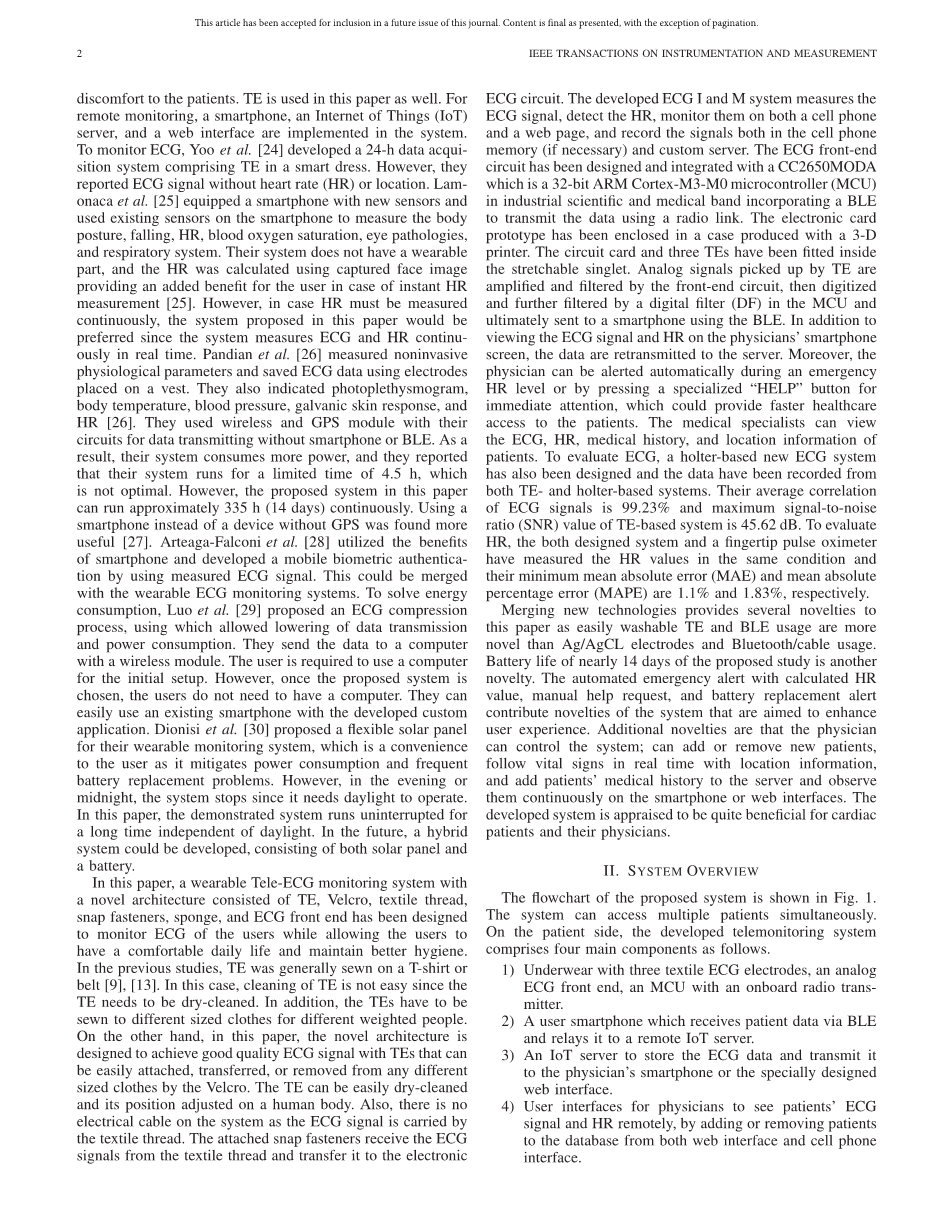 本文设计了一种由纺织电极(TE)、尼龙搭扣、纺织线、扣件、海绵和ECG前端组成的新颖架构的穿戴式远程心电监护系统,在监测用户心电的同时,让用户在舒适的日常生活中保持更好的卫生。在以前的研究中,TE通常被缝在T恤或皮带[9]、[13]上。在这种情况下,因为TE需要干洗,因此清洗很不容易。此外,必须为不同的体重的人将TE缝到不同大小的衣服中。另一方面,本文设计的新颖架构是为了实现使用TEs获取高质量的心电信号,TE可以通过尼龙搭扣方便地附着、转移或从任何不同尺寸的衣服上取下。它可以很容易地进行干洗,而且它的位置可以在人体上进行调整。此外,由于心电信号是由纺织线传送的,所以系统上没有电缆。所附的扣件接收来自纺织线的心电信号,并将其传输到电子心电电路。所开发的ECG I和M系统测量心电信号,检测心率,同时在手机和网页上对其进行监控,并将信号记录在手机内存(如有必要)和自定制服务器中。本文设计出ECG前端电路并将其与CC2650MODA集成。CC2650MODA是一个32位ARM Cortex-M3-M0微控制器(MCU),在工业、科学和医学波段,利用BLE通过无线电链路传输数据。电子卡的原型已被封装在一个用3d打印机制作的盒子里。电路卡和三个纺织电极已安装在可拉伸的汗衫内。TE接收到的模拟信号经过前端电路放大和滤波,然后通过MCU中的数字滤波器(DF)进行数字化和进一步滤波,最后通过BLE发送到智能手机上。除了能在医生的智能手机屏幕上查看患者的心电信号和心率之外,数据还会重新传输到服务器。此外,医生可以在受试者达到紧急心率水平时收到自动警报,或受试者通过按一个专门的“帮助”按钮立即得到关注,这可以为患者提供更快的医疗服务。医疗专家可以查看病人的心电图、心率、病史和位置信息。为了评估心电图,我们还设计了一种基于动态心电图(holter)技术的新型心电图系统,并记录了基于TE和holter系统的数据。两种心电图信号的平均相关系数为99.23%,基于TE的系统最大信噪比为45.62dB。为了评价心率,本文所设计的系统和指尖脉搏血氧仪测量了相同条件下的心率值,它们的最小平均绝对误差(MAE)和平均绝对百分误差(MAPE)分别为1.1%和1.83%。