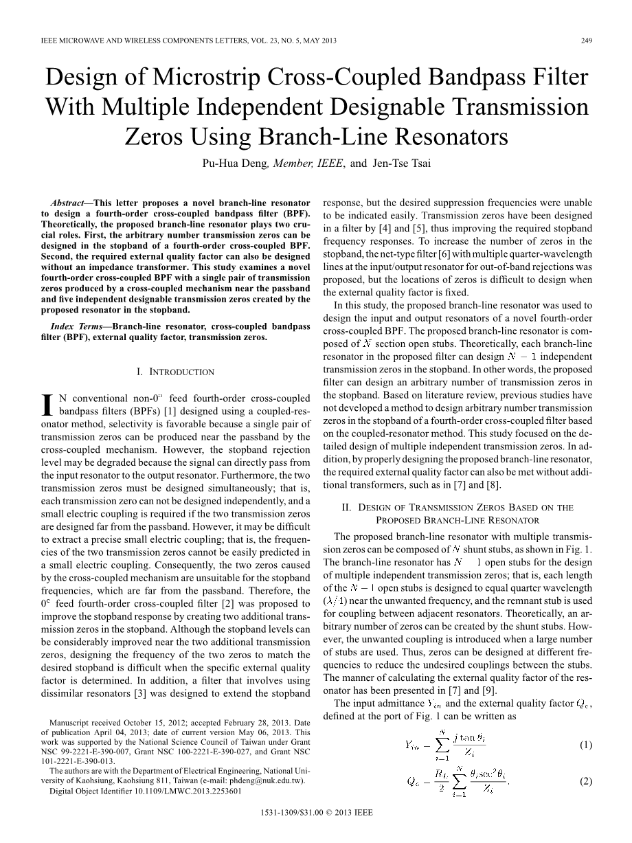 使用分支线谐振器设计具有多个独立可设计传输零点的微带交叉耦合带通滤波器