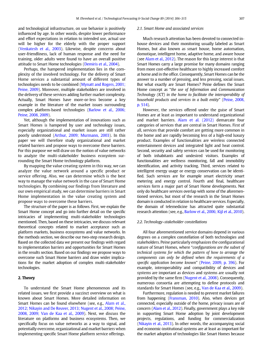 或许,阻碍实施的关键在于所涉及的技术的复杂性。对于智能家居服务大量不同类型的技术需要结合交货(迈纳特和罗杰斯,2001;peine,2009)。此外,倍数以持有人参与交付这些服务进一步增加市场的复杂性。其实,智能家居已经或多或少的成为周围复杂的基于平台的技术市场问题的文学一个重要的例子(巴洛等人,2006;peine,2008,2009)。