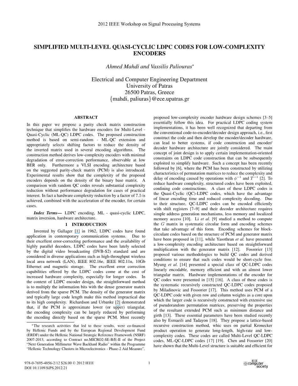 由Gallager在1962发明,LDPC码已经发现在现代通信系统中的应用。由于其优异的纠错性能和可用性的高度并行解码器,LDPC码已在最近被数字视频广播(DVB-S2)选择作为标准,在不同的领域进行应用如高吞吐量的无线局域网络(LAN),IEEE 802.16e,IEEE 802.11n,10Gb以太网和磁存储。通过提供优良的LDPC码的纠错能力随着硬件的复杂性成本的提高而体现,尤其是长码。在LDPC编码器的设计中,简单的方法是乘法来实现PCM的密集稀疏生成矩阵。发电机矩阵的密度通常为大码长,由于其高复杂性,使这种方法不切实际。理查德森和Urbanke 表明,如果PCM是近似下(或上)三角形,编码复杂度可以直接基于稀疏编码PCM进行大幅减少。最近的研究活动,导致了这些结果,希腊资金由欧洲区域发展基金(ERDF)希腊国家战略共同提供经济支持,根据项目的“下一代毫米波回程无线电”计划同“希腊技术集群在微电子技术二期援助措施”的合同no.micro2-se-b/e-ii。提出了基本上遵循这个想法的低复杂度的编码器硬件设计方案。对于实际的LDPC编码系统的应用,它已被公认为偏离常规码编码器/解码器的设计方法,即首先构建代码,然后开发的编码器/解码器的硬件,如果代码结构和编码器/解码器的硬件架构共同考虑,可以导致更好的系统。联合设计的主要概念是应用一定的实施导向约束对LDPC码的构造,随后可以利用简化的硬件。这样的概念最近已由验证,其中PCM已利用置换矩阵的特点建立相应的降低复杂度和编码的操作所造成的延误和。为了降低硬件复杂度,结构化代码被开发利用,用来满足构造。一类LDPC码的准循环名为(QC)- LDPC码,具有线性的编码时间的优势和降低复杂度的解码的优势。由于其结构,QC-LDPC码可以有效地编码移位寄存器和译码器结构需要简单的地址生成机制,更少的内存和局部存储器访问。Li研究了一种计算矩阵的方法,利用这种形式,在系统的循环形式和编码方案。编码方案-基于块PCM和发电机的结构矩阵的循环码已经在提出,而yasothran等人提出了一种低复杂度的编码架构,基于简单的乘法与发电机矩阵。Fossorier提出各种方法建立QC码和衍生条件确保代码可以周期短。Myung等人提出了一类特殊的QC-LDPC码的线性编码,高效的内存和一个几乎下三角矩阵,在论文中提出的编码器的硬件实现。一类这些代码是系统的递归构造QC-LDPC码被Miladinovic和Fossorier 提出了。该方法采用PCM的QC-LDPC码的特定的行和列的权重为核心的大码的递归构造与伪随机置换矩阵的广泛使用,保护得到扩展的PCM的特性如最小距离和环。这些重要的参数也被tadayon Esmaeili在论文中研究。他们提出了一个基于格的递归构造方法,对部分积产生操作而使用长度长,高速率和低复杂度的代码。这些代码被称为多层次的准循环LDPC码,ml-qc-ldpc码。Chen和Fossorier 表明,多层次结构在低复杂度中可扩展的LDPC码译码器的高通量的实现是有效的。最近tsatsaragkos和paliouras提出硬件解码器架构代码。