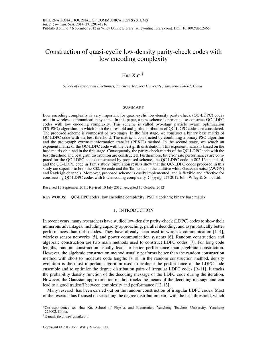 从一个产生矩阵的QC-LDPC码的编码可能有些复杂。该的QC-LDPC码的低编码复杂度是在无线的有效传输重要通道。这是可能的,从奇偶校验矩阵被直接构造的QC-LDPC码,其可以显著降低编码复杂。