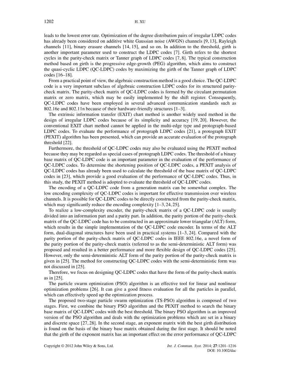 关键词:QC-LDPC码 低编码复杂度 PSO算法 二进制矩阵