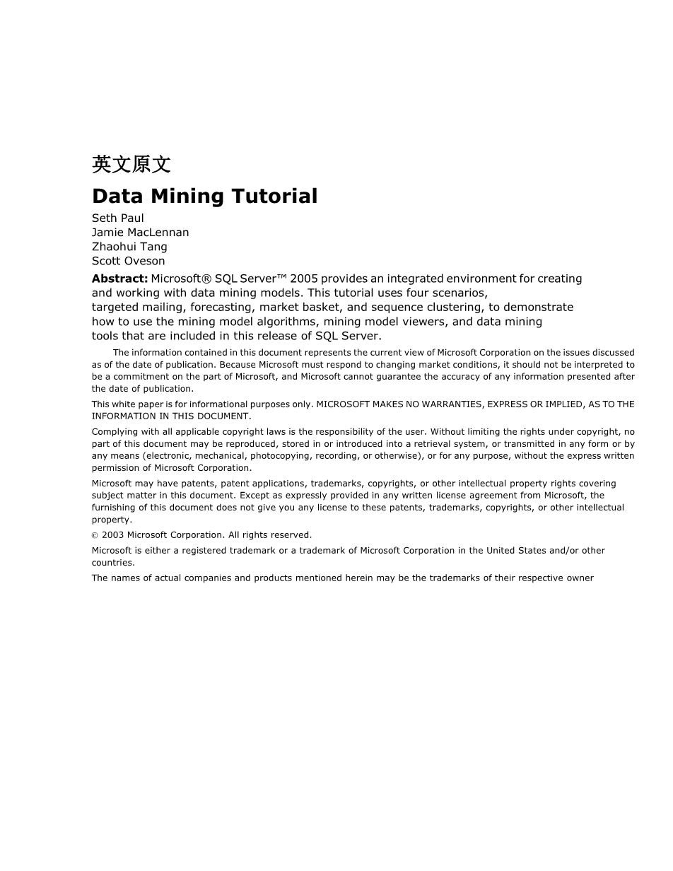 数据挖掘教程的目的是引导您通过微软SQL Server 2005创建数据挖掘模型 。该数据挖掘算法和工具,在SQL Server 2005可以很容易地建立一个全面的解决方案的各种项目,包括购物篮分析,预测分析,和邮购分析。对这些解决方案的描述在教程中有更详细的解释。