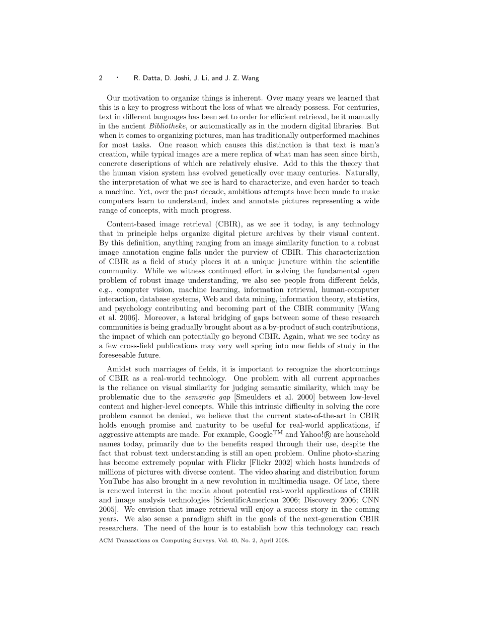 基于内容的图像检索(CBIR),正如我们今天看到的,是任何技术原则上有助于组织数字图像档案的视觉内容。通过这个定义,任何从图像相似性函数的一个强大的图像标注引擎落CBIR的管辖范围。这种表征基于内容的图像检索领域的研究作为一个地方的科学独特的交界处社区。当我们目睹其在解决基本的开放继续鲁棒图像理解的问题,我们也看到来自不同领域的人,计算机视觉,机器学习,信息检索,人机交互交互,数据库系统,网络和数据挖掘,信息理论,统计,并成为CBIR社区[王部分贡献的心理学等人。2006 ]。此外,一些研究之间的差距横向桥接社区正在逐渐被带来的副产品,这样的贡献,它的影响可能超出了基于内容的图像检索。再次,我们今天看到的一些跨领域的出版物很可能在新的领域中的研究