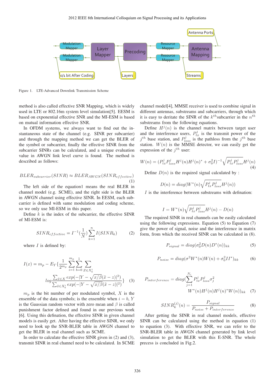 在系统级仿真中,真正的链接活动例如信源编码、信道编码、交互干扰等都将不会被施行,因为在仿真中有大量的用户和基站(BSs)模拟,计算荷载往往是趋向于无法接受。所以系统级到链接级别执行映射[3]。在系统级仿真,插值被用于得到最终的块误码率并使用预先生成SNR-BLER表AWGN信道的链路级仿真。ESM方法也称为有效信噪比映射,这是广泛使用在LTE或802.16系统级仿真[5]。EESM指数是基于有效的信噪比和MI-ESM基于共同信息有效的信噪比。