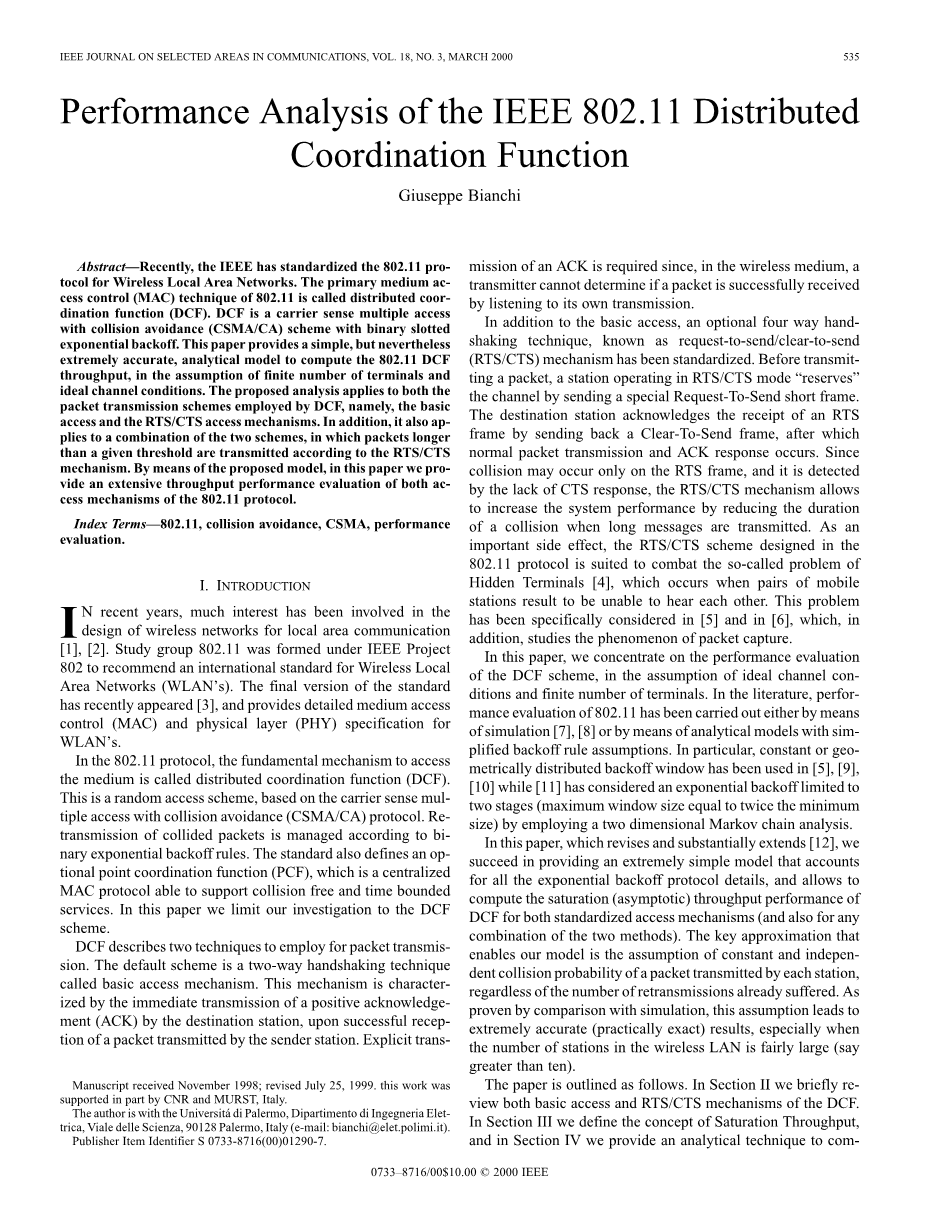 摘要——最近, IEEE 802.11为无线局域网制定了协议规范。802.11主要媒介访问控制(MAC)技术被称为分布式协调函数(DCF)。DCF是一种带有二进制指数退避的载波侦听多路访问(CSMA / CA) 冲突避免的机制。本文在有限数量的终端和理想信道的条件下,提供了一个简单但相当精确的分析模型来计算802.11 DCF的吞吐量。提出的分析适用于DCF中基本接入方式和请求发送/清除发送协议下的的数据包传输方案。另外,它也适用于数据包超过RTS/CTS协议给定的阈值时使用这两种接入方式的组合方案。在本文中,通过该模型我们为802.11协议中的接入机制提供了一个广泛适用的吞吐量性能评估。