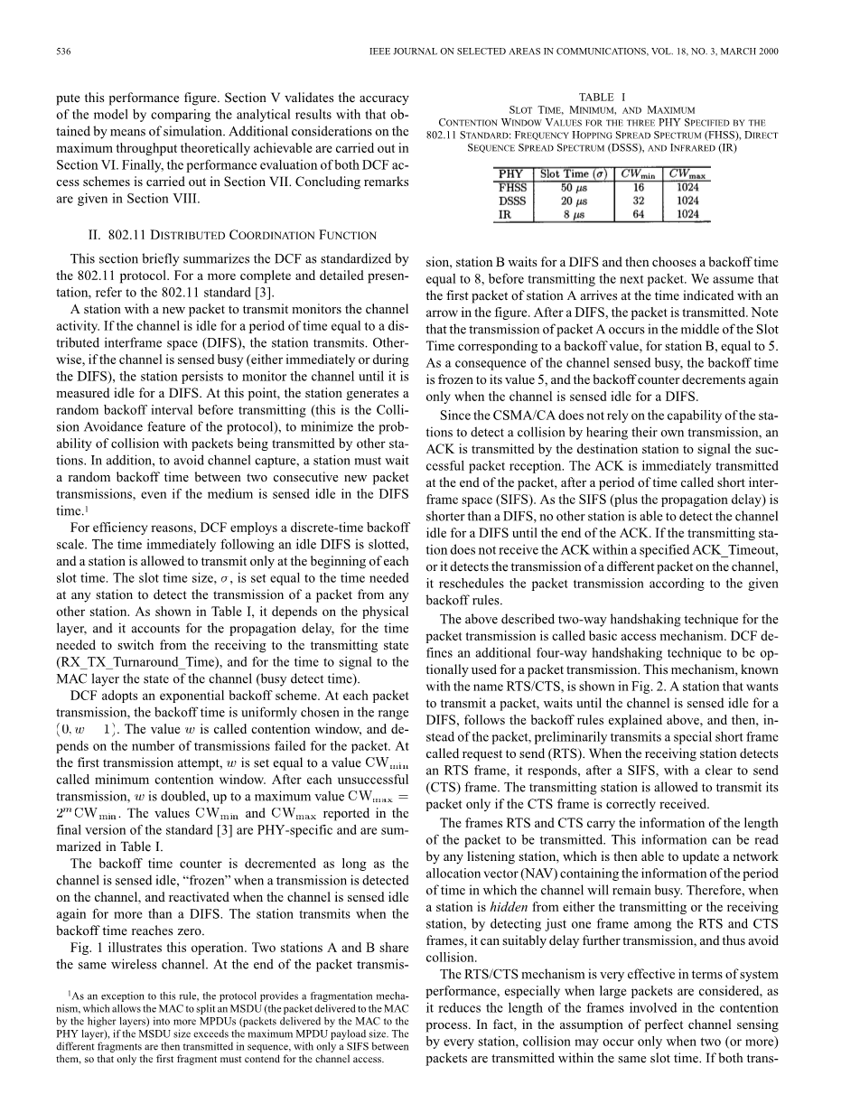 DCF采用指数退避方案。在每个数据包传输时,退避时间一律在特定范围内选择。大小被称为竞争窗,取决于传输失败的数据包数量。在第一次传输中,竞争窗大小为最小值。每次传输失败后,竞争窗大小加倍,直至到最大值。最终版本的值在标准[3]PHY-specific,总结在表一。