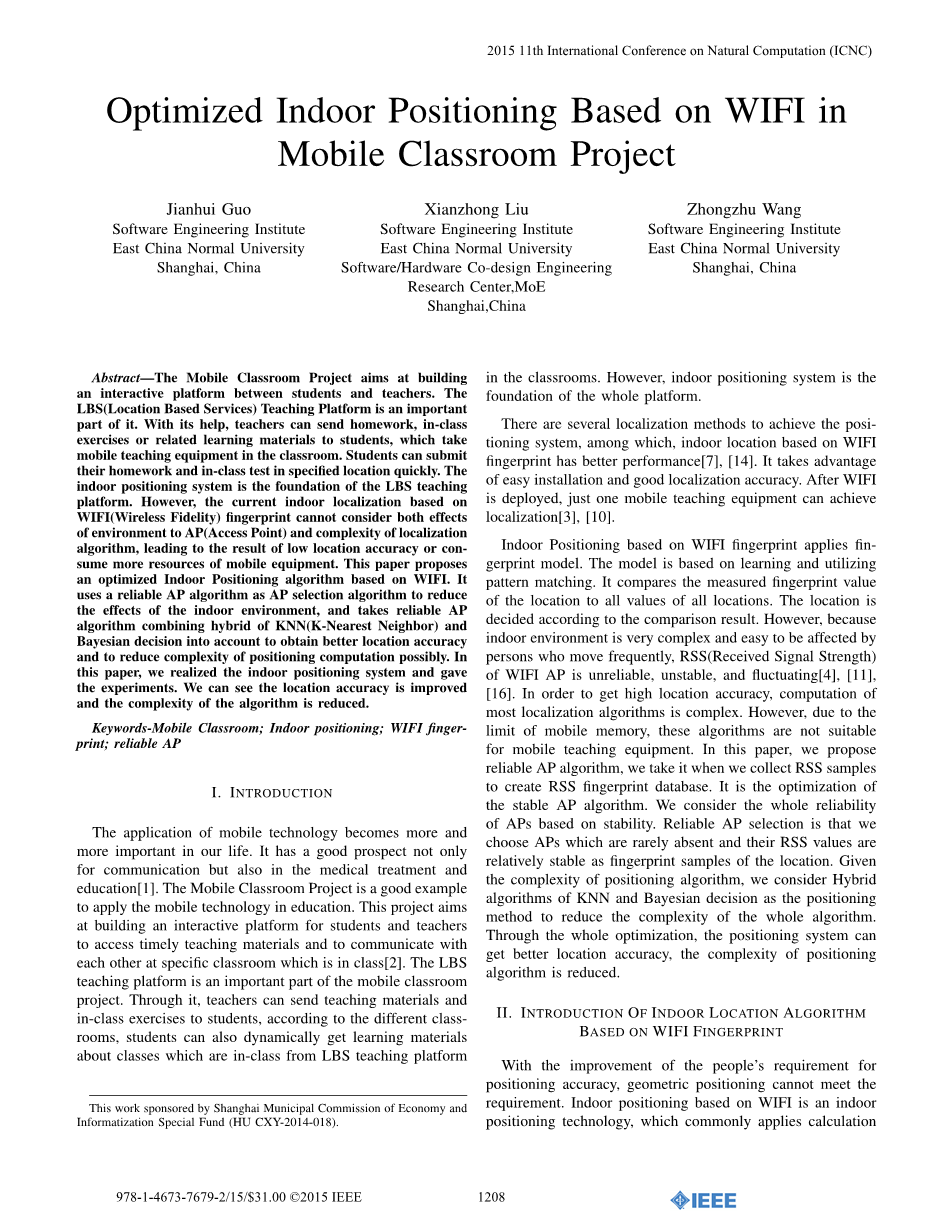 移动教室项目旨在建立学生与教师之间的互动平台。LBS(基于位置的服务)的教学平台是其重要的组成部分。有了它的帮助,老师可以通过移动教学设备,把作业,课堂练习或者是课堂学习材料发给学生。学生可以在指定地点迅速提交作业和课上测试。室内定位系统是LBS平台教学的基础。然而,当前基于WiFi指纹的室内定位既没有考虑到环境对接入点的影响,也没有考虑到定位算法的复杂性。导致定位精度低或消耗更多的移动设备资源。本文提出了一种优化的基于WiFi的室内定位算法。它使用一个可靠的接入点算法作为接入点选择算法来减少室内环境的影响,并采取可靠的接入点算法结合混合算法KNN和贝叶斯决策考虑获得更好的定位精度并且降低计算复杂度。在本文中,我们实现了室内定位系统,并给出了实验。我们可以看到的位置精度的提高和算法复杂性的减小。
