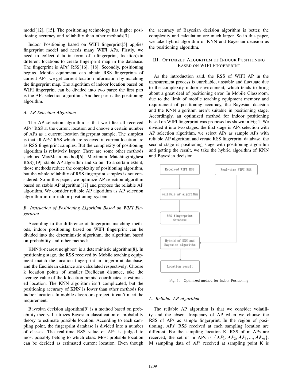 基于WiFi指纹的室内定位应用指纹定位模型。该模型是基于学习和利用模式匹配。它比较了所有位置的位置的测量值的指纹值。根据比较结果确定该位置。然而,由于室内环境复杂,容易被人移动经常受到影响,RSS(接收信号强度)的WiFi AP是不可靠的,不稳定的,波动。为了获得较高的定位精度,大多数定位算法的计算是复杂的。然而,由于移动存储的限制,这些算法是不适合移动教学设备。在本文中,我们提出了可靠的AP算法,我们把它当我们收集RSS样本创建RSS指纹数据库。它是稳定的算法的优化。我们认为,基于稳定性的APS的整体可靠性。可靠的AP选择是我们选择AP很少缺席,他们的RSS值相对稳定的位置指纹样本。鉴于定位算法的复杂性,我们考虑和KNN算法的贝叶斯决策的混合算法来降低整个算法的复杂度的定位方法。通过整个优化,定位系统可以得到更好的定位精度,定位算法的复杂度降低。