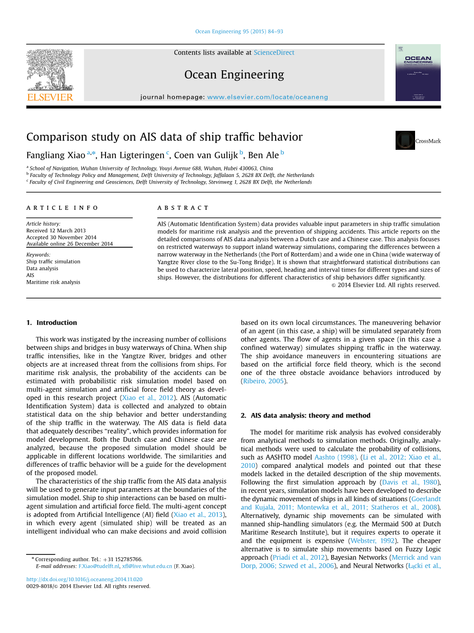 AIS(船舶自动识别系统)数据在船舶交通仿真、海上风险分析模型与航运事故防范等方面提供有价值的输入参数。本文将AIS数据分析的荷兰案例和中国案列之间进行了详细的比较。分析的重点在限制航道,以支持内河模拟,比较荷兰(鹿特丹港)和在中国一个宽的内河(长江上接近苏通大桥的一个宽的水道)之间的差异。它表明,简单的统计分布可以用于表征不同类型和尺寸的横向位置、速度、标题和船舶的间隔时间。然而,船舶行为的不同特性的分布却差异显著。