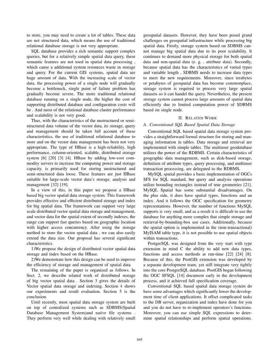 本文剩下部分的组织结构如下:在第二部分,我们描述了大规模矢量空间数据分布式存储的相关工作;第三部分详细讲述了矢量空间数据的存储和索引;第四部分给出了我们的实验和结果评估;第五部分是小结。