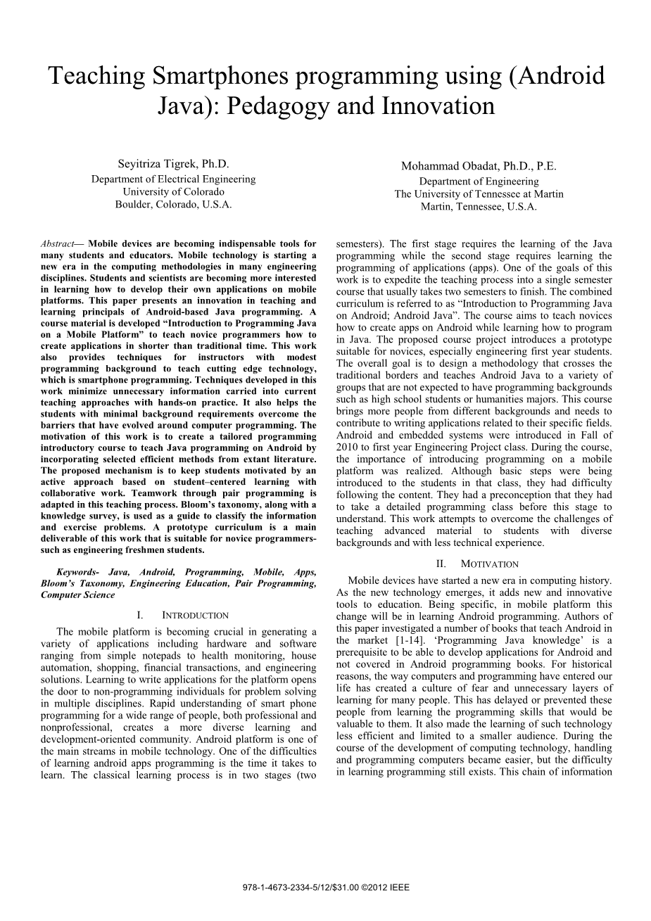 移动设备正在成为众多学生和教育工作者不可或缺的工具。在许多工程学科中,移动技术已开启了计算方法的新纪元。学生和科学家们对学习如何在移动平台上开发自己的应用程序越来越有兴趣。本文将创新性的提出基于Android的Java编程教学原则。本文开发的一个课程材料“移动平台的Java程序设计入门”可以用来教授新手程序员如何在比传统开发在更短的时间内创建出应用程序。智能手机编程也为那些有着适度编程背景的教官提供了能够教授尖端技术的技巧。在这项工作中开发的技术最大限度地减少了目前教学方法中不必要的信息。这项技术也可以帮助那些编程背景很少的学生克服在计算机编程中遇到的障碍。这项工作的动机是通过从现存文献中选择更有效的方法创建一个定制的编程入门课来教授基于Android的Java编程。我们建议的方法是在保持学生积极态度的基础上,以学生为中心的学习与协同工作。在这个教学过程中,我们采用结对编程的团队协作。布卢姆认知分类,与问卷调查一起,作为导向,把信息和收集的问题进行分类。打造一个原型课程是这项工作的主要成果,这个课程非常适合新手程序员如工程类新生。