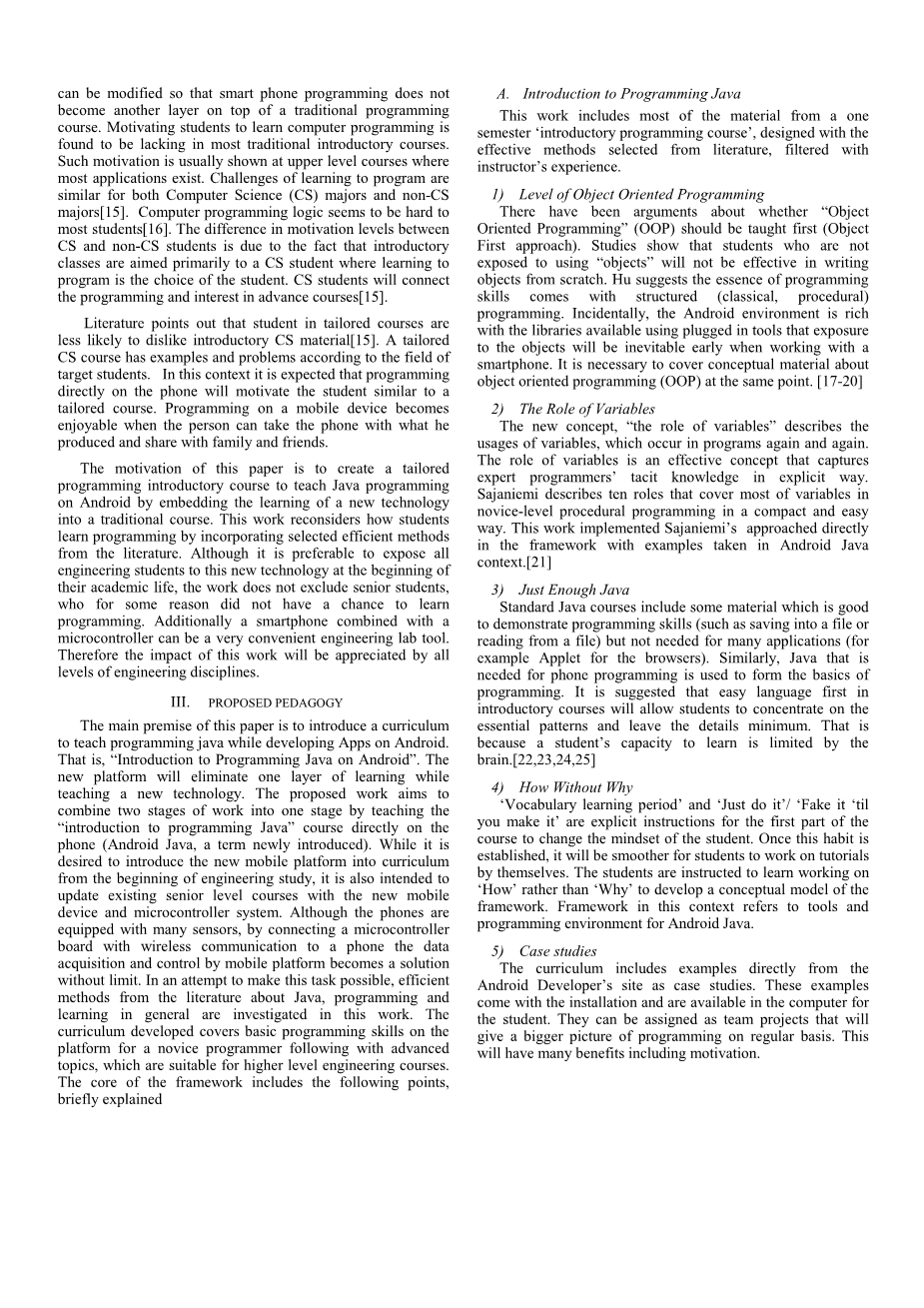 移动设备开启了计算史上的新时代。随着新技术的出现,它为教学增加了新的工具。具体来说,移动平台的这种变化我们将会在Android编程中感受到。本文作者研究了市场上一系列教大家学习Android的书籍[1-14]。“Java编程知识”是能够开发Android应用程序的先决条件并且在众多Android编程的书里都没有涉及到。由于历史的原因,计算机和编程的方式已经进入我们的生活,为很多学习它们的人创造了一种文化的恐惧和不必要的方面。这虽然已经推迟或阻止了一些人学习的编程技能的提升,但对他们来说是有价值的。同时,这也使学习这个技术变得效率低下,使这些技术的学习仅限于一小部分人。在计算机技术的发展过程中,处理和编程变得很容易,但学习编程的难度仍然存在。本课程的信息链可以被修改,从而使智能手机编程教学不会成为另一个层面上的传统编程课程。大多数传统的入门编程课程最缺乏的是激发学生们学习计算机编程的兴趣。这种动机通常表现在高级课程中,这些高级课程中存在大量的应用程序设计。编程学习中的挑战对计算机科学学科和非计算机学科的同学们来说都是类似的[15]。计算机编程逻辑对大多数学生来说很难[16]。计算机科学学科和非计算机学科的学生有着不同的动机水平,这主要是因为那些编程入门课程主要是为那些自己选择学习编程的计算机学科的学生们开设的。计算机学科的学生们主动接近编程并对一些高级编程课程有着浓厚的兴趣[15]。文献中指出,在定制的课程中,学生很可能非常喜欢一些计算机科学材料的引入[15]。定制的计算机科学依据目标学生群体有着对应的范例与问题研究。在这种情况下,我们预计直接在手机上的像定制课程那样的编程课程能够激励学生。当人们拿着手机并用着自己开发的手机应用程序展示给家人和朋友时,就会感受到移动编程带来的快乐。本文的动机是创建一个定制的编程入门课程通过嵌入新技术的学习到传统课程的方法教授人们Android的Java编程。这项工作重新考虑学生们如何通过结合从文献中选择有效的方法学习编程。虽然在所有工程专业的学生学术生涯的开始阶段,让他们不断接受新技术的熏陶,这样做很好,但这也不排除那些错过学习编程的高年级的学生。此外,智能手机与微控制器相结合,可以说是一个非常方便的工程实验室工具。因此,这项工作的影响将被所有级别的工程学科欣赏。