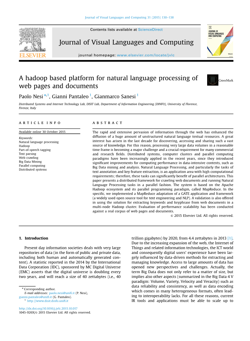 通过网络迅速和广泛的扩散的信息增加了大量的非结构化的自然语言文本资源。在过去十年中人们对发现、访问和分享这样一个庞大的知识资源表现出了极大的兴趣。出于这个原因,对于许多商业和研究领域在合理的时间内处理非常大的数据量成为一个重大的挑战,一个至关重要的需求。近年来,分布式系统、计算机集群和并行计算模式已经越来越多地应用于,因为他们在数据密集型环境使计算性能显著改善,如大数据挖掘和分析。自然语言处理,尤其是文本注释的任务和关键特征提取,是一种具有高计算要求的应用领域;因此,这些任务可以利用并行体系结构的明显优势。本文提出一种分布式框架爬行网络文档和自然语言处理任务并行的方式运行。系统是基于Apache Hadoop生态系统及其并行编程模式,称为MapReduce。具体,我们实现了一个MapReduce改编的门应用程序和框架(一种广泛使用的开源工具文本工程和NLP)。验证还提供从多节点的Hadoop集群中的web文档中提取关键词和短语的解决方案。对网页和文档的真实语料库进行了性能可伸缩性的评估。