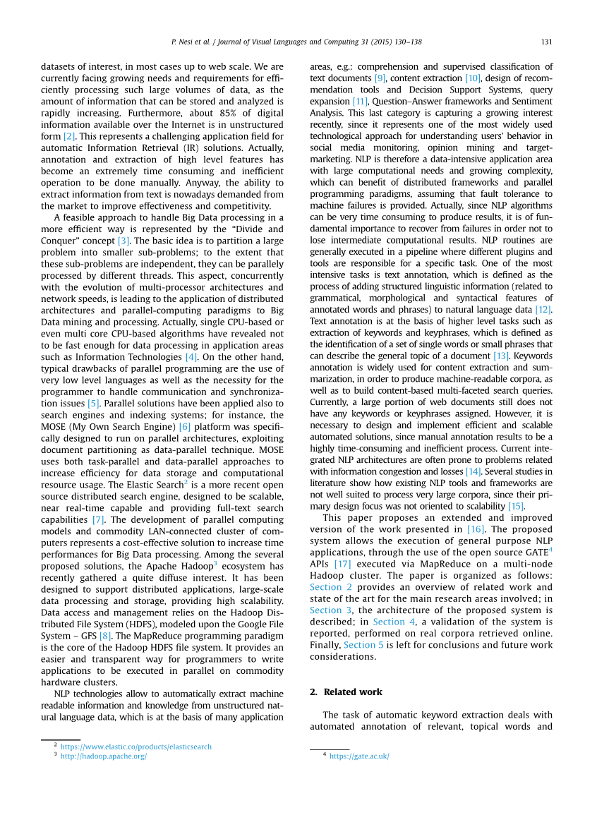 本文提出了一种扩展和改进版本的工作[16]。该系统允许通用NLP的执行应用程序,通过使用开源GATE4 APIs [17]通过执行MapReduce多节点的Hadoop集群。本文的组织结构如下:第二节概述的相关工作和国家艺术所涉及的主要研究领域,在第三节,提出系统的国内外发展状况和我国国情分析了势在必行;描述在第四节中,系统的验证报告,进行真正的集团奥拉在线检索。最后,第五部分是结论和未来的工作注意事项。