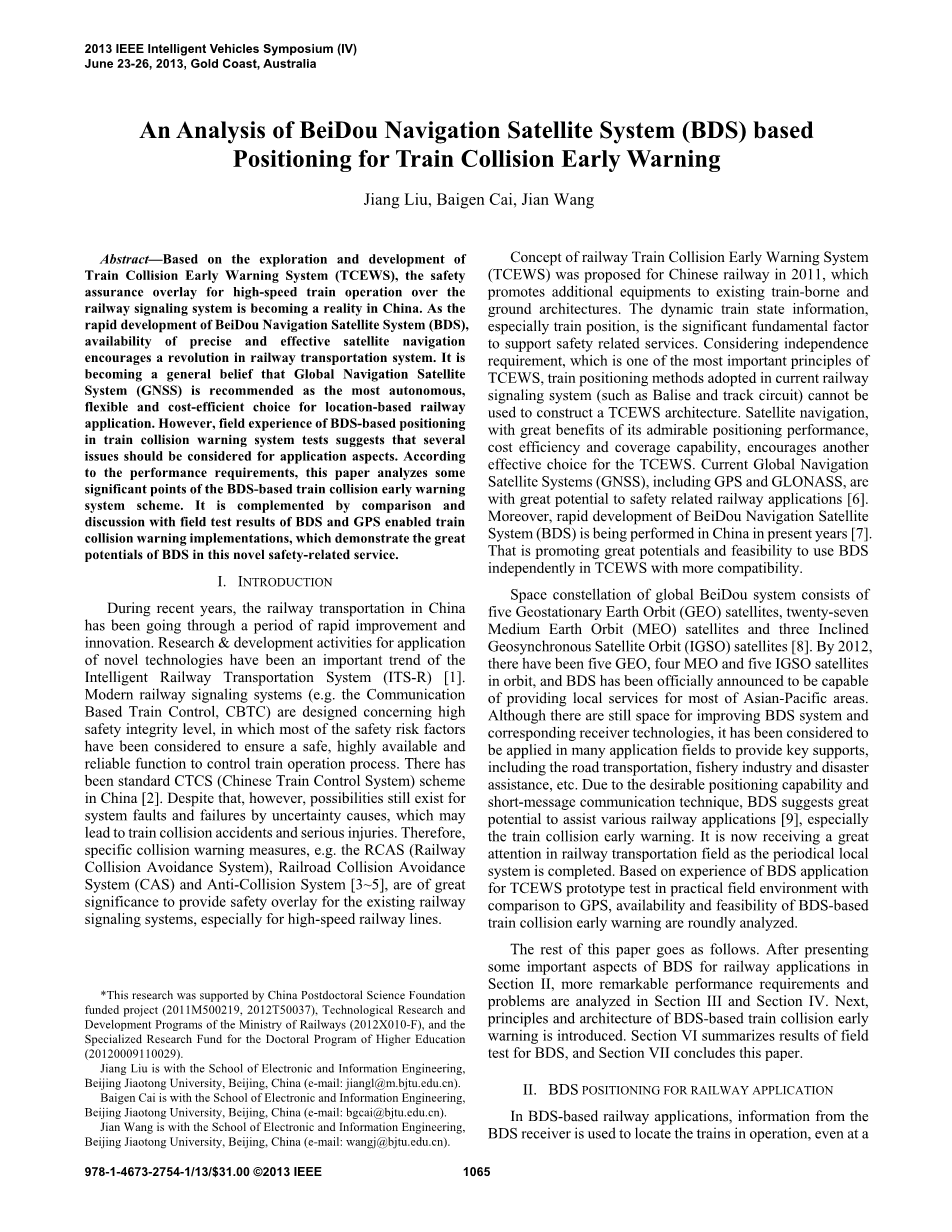 摘要—在对列车碰撞预警系统(TCEWS)进行探索和发展的基础上,高速列车运行在铁路信号系统上的安全保障覆盖已成为现实。随着北斗导航卫星系统(BDS)的迅速发展,精确和有效的卫星导航促使铁路运输发生了一场革命。全球导航卫星系统(GNSS)被公认为是基于位置的铁路应用系统中最自主、最灵活、最经济的选择。然而,在列车碰撞预警系统试验中,基于BDS定位的现场经验表明,在实际应用中应考虑几个问题。根据实验要求,本文分析了基于BDS的列车碰撞预警系统方案的几个要点.。并与BDS和GPS支持的列车碰撞系统的现场试验结果进行了比较和讨论,证明了BDS在这种新型安全系统中的巨大潜力。
