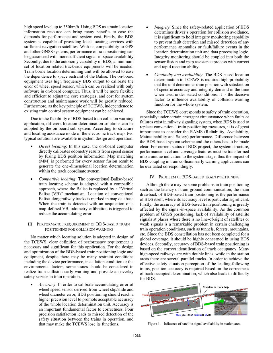 连续性和可用性:TCEWS中基于BDS的位置确定需要很高的概率,在规定的条件下使用时,该单元以满足特定精度和完整性要求的方式确定列车位置。它是影响整个系统碰撞预警功能可用性的决定性因素。