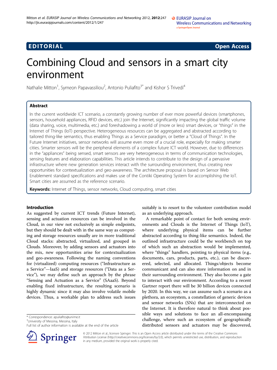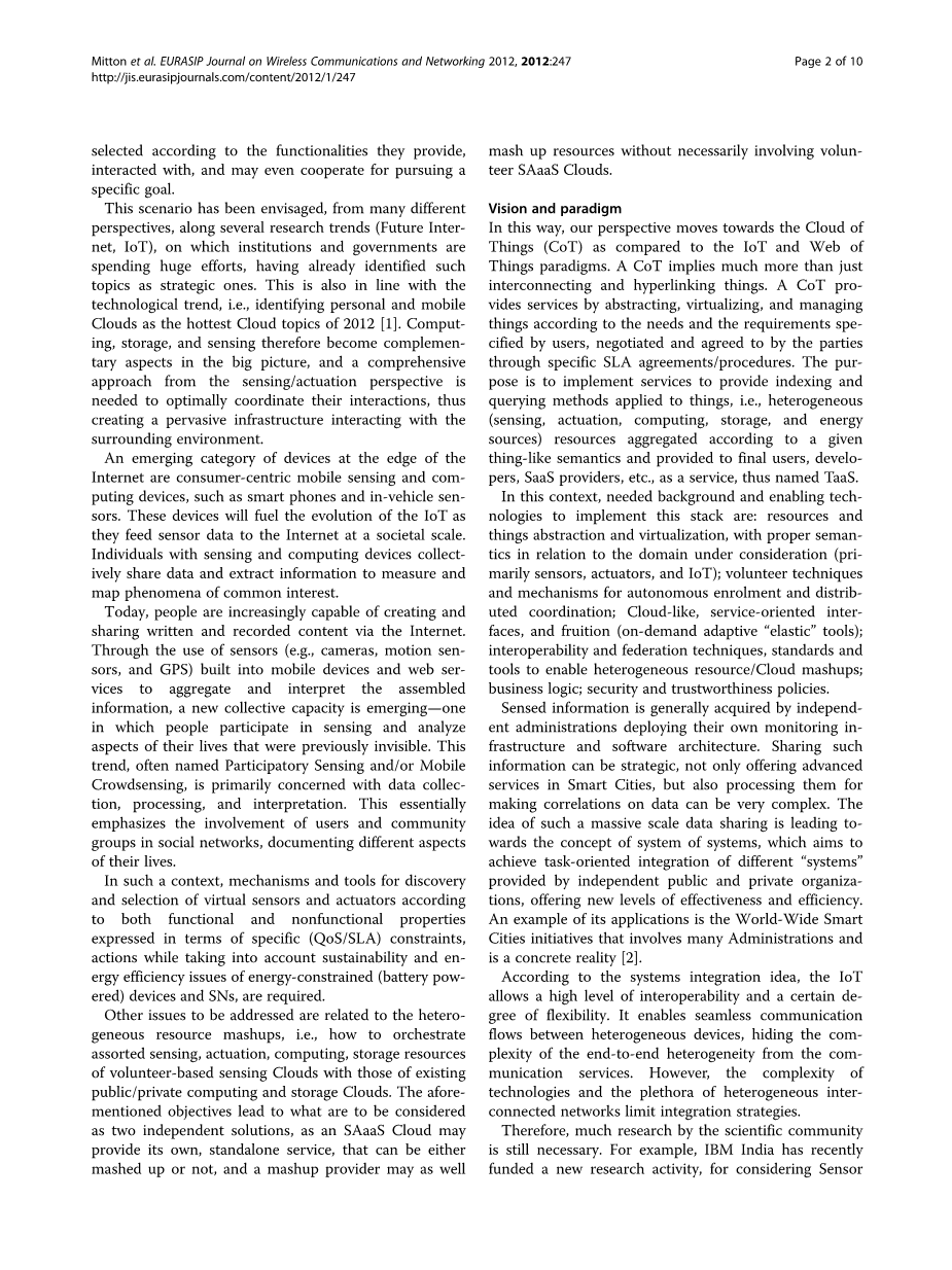 由目前的ICT趋势(未来互联网)来看,传感和驱动资源不仅仅是简单的端点,它们也可以加入云中来,但它们应该以相同的方式处理通常用在更传统的云栈:抽象、虚拟化和分组的云栈中的计算和存储资源。此外,通过增加传感器和致动器进行组合,在情景化和地理感知方面出现了新的机会。遵循(虚拟化的)计算资源(“基础架构即服务”-IaaS)和存储资源(“数据即服务”)的命名约定,我们可以用短语定义这种方法--“传感和驱动就是服务”(SAaaS)。除非能够提供固定的基础设施,否则由此产生的方案是高度动态的,因为它还可能涉及到不稳定的移动设备。因此,一个可行的计划来解决这些问题是适当地借助于志愿者贡献的可以作为潜在方法的模型。