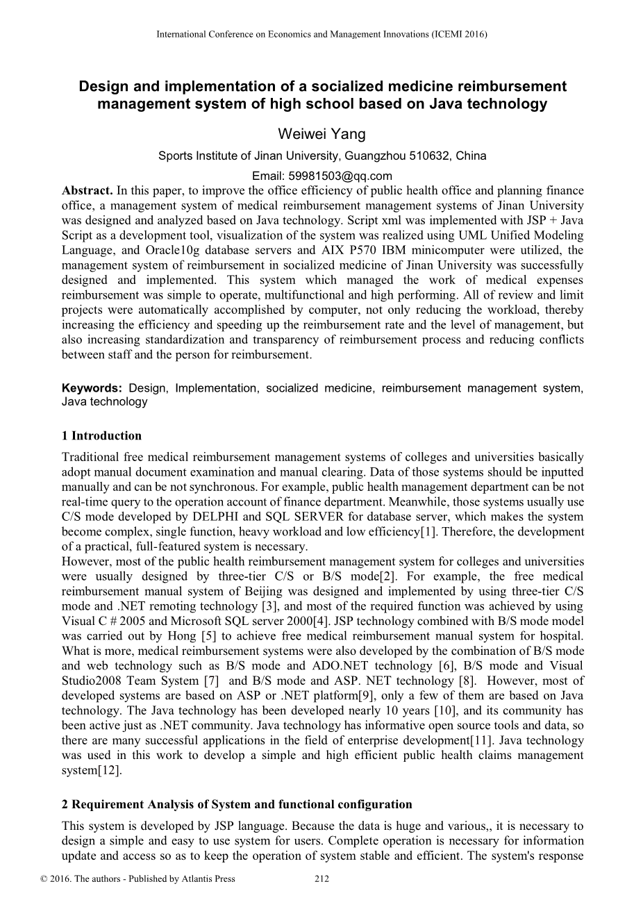 该系统由JSP语言开发。由于数据量巨大且各种各样,因此有必要为用户设计一个简单易用的系统。信息更新和访问需要完整的操作,以保持系统的稳定和高效运行。该系统的回应国际经济与管理创新会议(ICEMI 2016)copy;2016。作者 - 由AtlantisPress 212出版的能力应该相对较高,以满足信息和更新同步传输的要求。某些功能可能不被认为是全面的,并且某些特定功能可能在将来得到改进和增加,因此系统的扩展能力应该很强。该系统分为两个模块:公共卫生办公室和规划财务办公室。业务概述如下: