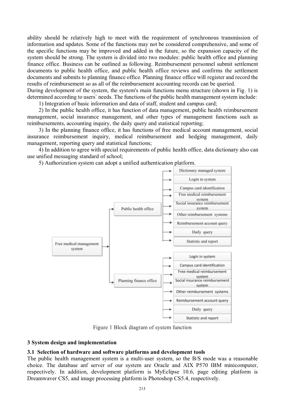 高校传统的免费医疗报销管理系统主要采用人工文件检查和人工清理。这些系统的数据应该手动输入并且可以同步进行。例如,公共卫生管理部门可以实时查看操作账户的部门。同时,系统通常使用DELPHI和SQL SERVER为数据库服务器开发的C / S模式,这使得系统变得复杂,单一功能,重负荷和低效率[1]。因此,开发实用, 全功能系统是必要的。然而,大多数大学和大学的公共健康报销管理系统通常采用三层C / S或B / S模式设计[2]。例如,北京的免费医疗报销手册系统是使用三层C / S模式和.NET远程技术[3]设计和实现的,大部分所需功能是通过使用VisualC#2005和Microsoft SQLserver2000 [4]实现的。结合B / Smode模型的JSP技术由Hong [5]实施,以实现医院的免费医疗报销手册系统。此外,医疗报销系统由B / Sm模式和Web技术组合开发,如B / S模式和ADO.NET技术[6],B / S模式和Visual Studio2008团队系统[7]以及B / S模式和ASP.NET技术[8]。但是,大多数开发的系统都基于ASP或.NET平台[9],其中只有少数基于Java技术。Java技术已经发展了近10年[10],其社区一直被视为.NETcommunity。Java技术具有信息开发工具和数据,因此在企业开发领域有许多成功的应用[11]。在这项工作中使用Java技术来开发一个简单而高效的公共卫生索赔管理系统[12]。