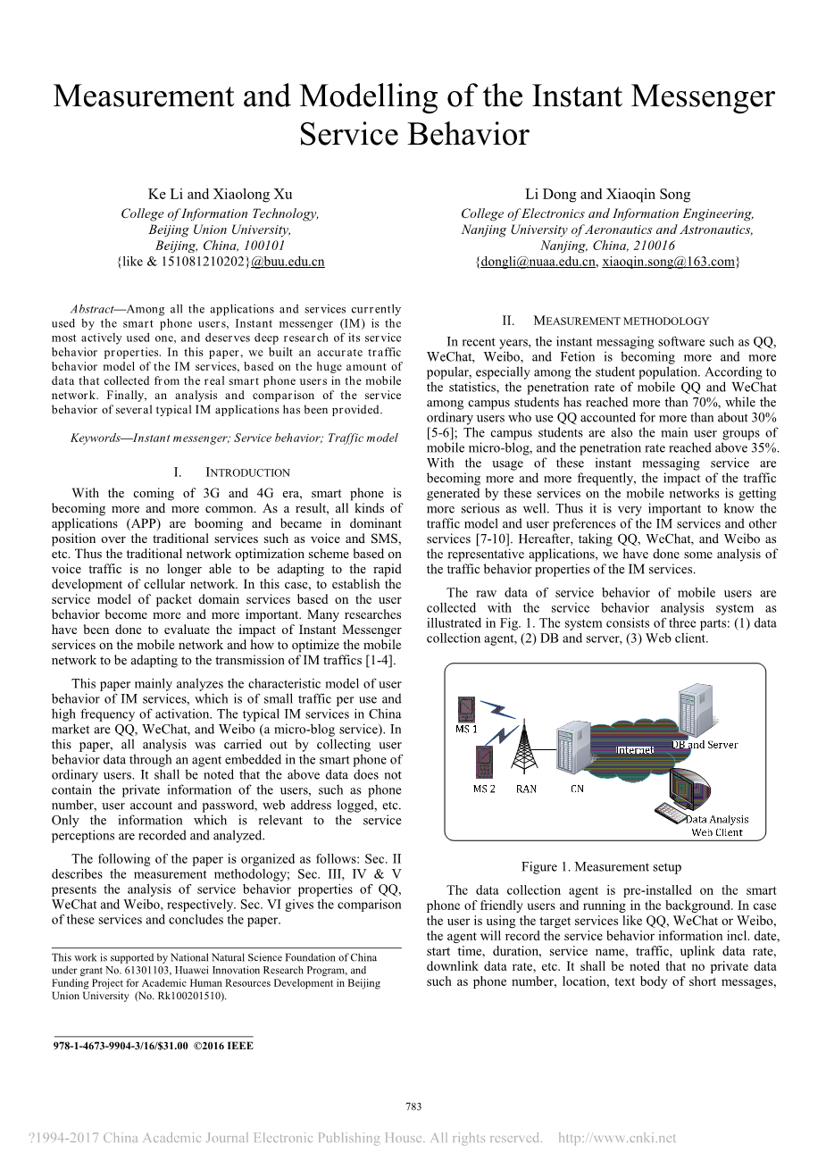 本文的下列组织如下:II描述测量方法;秒。 III,IV&V介绍了QQ的服务行为属性分析,WeChat和微博分别。秒。 VI给出比较的这些服务,并得出结论。