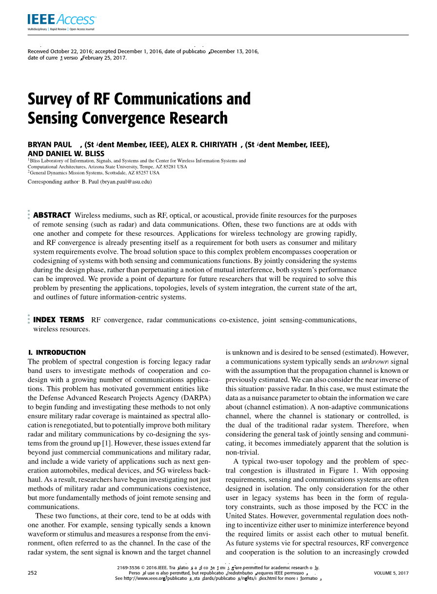 摘要 无线媒体,如射频、光学或声学媒体,为遥感(如雷达)和数据通信提供了有限的资源。通常,这两个功能相互不一致,并争夺这些资源。无线技术的应用正在迅速增长,随着消费者和军事系统需求的发展,射频融合已经成为用户的需求。这一复杂问题的广泛解决空间包括具有传感和通信功能的系统的合作或协同设计。通过在设计阶段共同考虑系统,而不是延续相互干扰的概念,可以提高两个系统的性能。我们为未来的研究人员提供了一个出发点,我们将需要通过展示应用程序、拓扑、系统集成水平、当前的技术水平和未来信息中心系统的概述来解决这个问题。