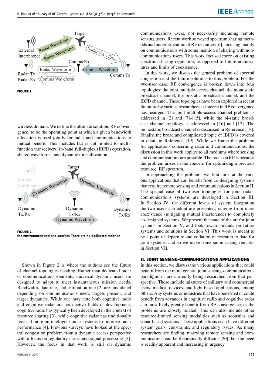 图2所示,作者看到了通道拓扑标题的未来。与专用的雷达或通信元件,通用动态用户被设计以满足瞬时任务需求。带宽、数据速率和估计速率[2]根据通信需求、目标存在和目标动态进行调制。虽然人们可能会注意到认知无线电和认知雷达都是活跃的发展领域,但认知无线电通常是在资源共享[3]的背景下开发的,而认知雷达传统上更专注于智能雷达系统,以提高雷达性能[4]。以前的调查已经从动态访问的角度来研究频谱拥塞问题,重点关注监管问题和信号处理[5]。然而,这项工作的重点仍然是动态通信用户,而不一定包括遥感用户。最近的工作调查了频谱资源共享方法和[6]的未充分利用,主要集中在通信上,其中提到了与非通信用户的共享。这项工作更多地关注现有的频谱共享规则,而不是未来的架构和共存的限制。在这项工作中,我们讨论了频谱拥塞的一般问题和这个问题的未来解决方案。对于双用户情况,射频收敛可分为四种拓扑结构:联合多址信道、单静态广播信道、双静态广播信道和IBFD信道。这些拓扑已经在最近的文献中被不同的研究人员对射频收敛的兴趣重新激发。联合多址信道问题在[2]和[7]-[15]中被解决,而双静态广播信道拓扑问题在[16]和[17]中被解决。在参考文献[18]中对单静态广播信道进行了讨论。最后,参考文献[19]详细介绍了IBFD的广泛而复杂的主题。虽然我们将这个问题应用于与雷达和通信有关的应用,但这项工作中的讨论适用于所有有可能进行传感和通信的媒介。对射频的关注是因为这个问题出现在关注优化一个宝贵的资源:射频频谱。在解决这个问题时,我们首先来看看在第二节中可以从共同设计需要遥感和通信的系统中受益的各种应用程序。第三节介绍了联合雷达通信系统的双用户拓扑结构的特殊情况。在第四节中,介绍了两个用户可以采用的不同级别的系统集成,从仅仅共存(减轻相互干扰)到完全共同设计的系统。我们在第五节中介绍了联合系统的最新技术,并在第六节中展望了未来系统和解决方案的边界。这项工作是迄今为止联合系统研究的出发点和整理点,因此我们在第七节中作了一些总结意见。