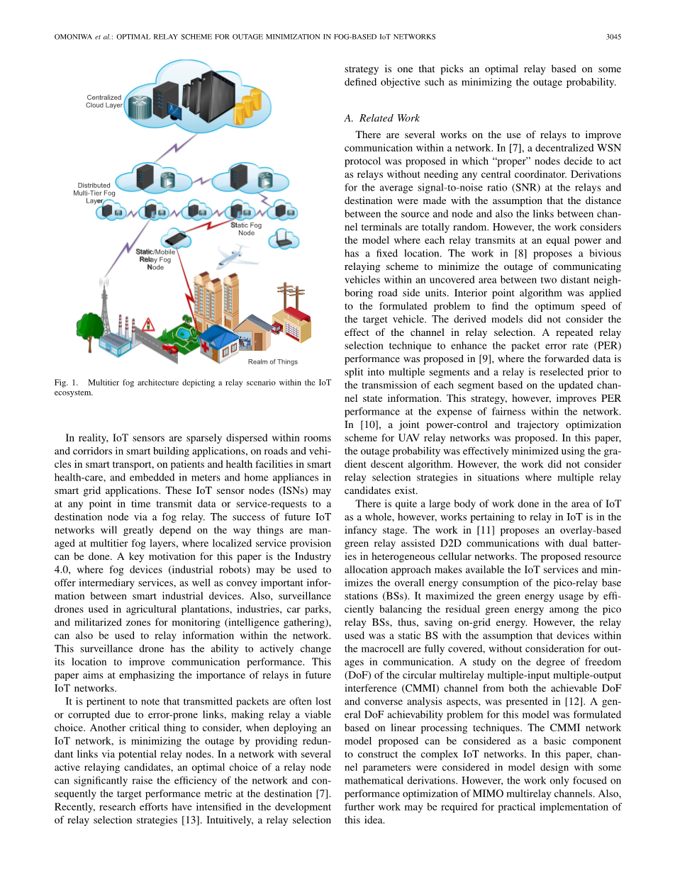 实际上,物联网传感器分散在智能建筑应用的房间和走廊、智能交通的道路和车辆、智能医疗的患者和医疗设施中,并嵌入智能电网应用的仪表和家用电器中。这些物联网传感器节点(ISNs)可以在任何时间点通过云中继向目的节点传输数据或服务请求。未来物联网网络的成功将在很大程度上取决于多层云层的人工老化方式,在这种情况下,可以提供本地化服务。本文的一个主要动机是工业4.0,其中云设备(工业机器人)可用于提供中间服务,以及在智能工业设备之间传递重要信息。此外,用于农业种植园、工业、停车场和军事监控区(情报收集)的监控无人机也可用于在网络中传递信息。这种无人侦察机能够主动改变位置,以提高通信性能。本文旨在强调中继在未来物联网中的重要性。