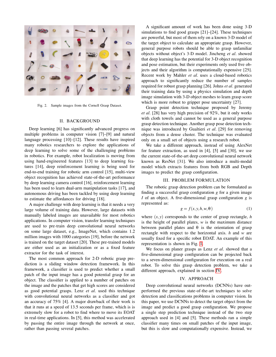 我们介绍了一种使用五维表示检测平行板夹持器的良好机器人抓握的新方法。我们的方法使用两个并行运行的50层深度卷积残差神经网络从RGB-D图像中提取特征,其中一个网络分析RGB分量,另一个网络分析深度信道。然后合并这些网络的输出,并将其馈送到另一个预测抓握配置的卷积网络。我们将这种方法与文献中的其他方法进行比较,以及仅使用RGB分量的模型的单模态变化。我们的实验是在标准的Cornell Grasp数据集上完成的。来自数据集的示例图像显示在图2中。我们的实验表明,所提出的架构在精度和速度方面都优于当前最先进的方法。