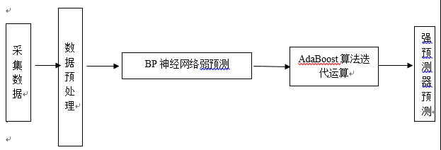 bp神经网络是一个多层前馈神经网络,训练方式是训练误差逐渐下降,每次迭代后训练的网络更加优秀,收敛速度更快。每一次迭代运算相对于上一次迭代运算训练误差减少,测试集的预测权值增加,最后按照权值大小合并每次迭代运算bp神经网络的输出,使得预测精度相比单个bp神经网络更高。基于adaboost算法的bp神经网络预测流程如图1,基于adaboost算法的bp神经网络预测步骤如图2.