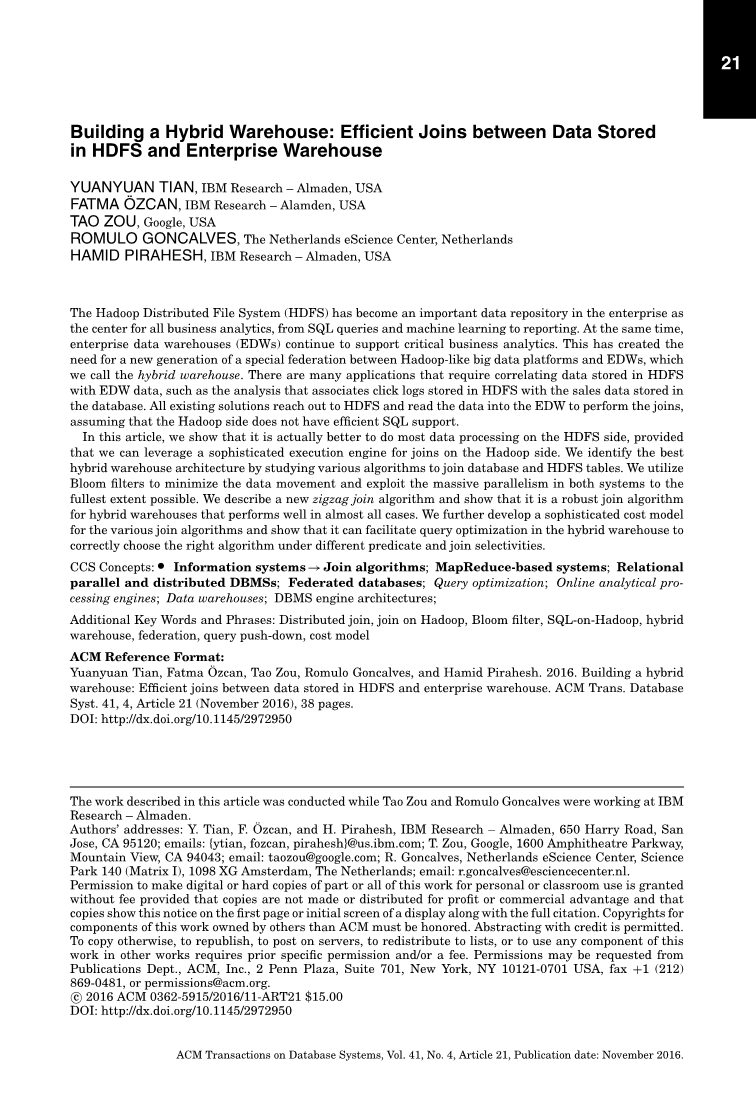 在本文中,我们展示了这样一个结论。当我们在Hadoop端利用复杂的执行引擎进行连接时,在HDFS端进行大部分数据处理表现更好。我们通过研究连接数据库和HDFS表的各种算法来确定最佳的混合仓库体系结构。我们利用布隆过滤器最大限度地减少数据移动,并最大限度地利用两个系统中所拥有的大量并行性。我们描述了一种新的Zigzag连接算法,并证明它是一种适用于混合仓库的健壮连接算法,在几乎所有情况下都表现良好。我们进一步为各种连接算法开发了一个复杂的代价模型,并证明了在不同的谓词和连接选择性下,它可以帮助混合仓库中的查询优化选择正确的算法。
