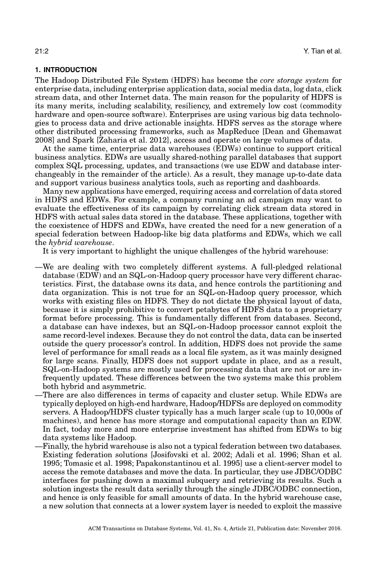 Hadoop分布式文件系统(HDFS)已成为企业中重要的数据存储库,并且已然成为包括SQL查询、机器学习以及报告等所有业务分析的中心。而与此同时,企业数据仓库(EDBs)仍旧支持着关键业务分析。这就产生了在类似Hadoop的大数据平台和众多EDW之间建立新一代特殊联合的需求,我们称之为混合仓库。有许多应用需要将存储在HDFS的数据与EDW的数据相关联,例如将存储在HDFS的点击日志与存储在数据库中的销售数据相关联的分析。假设Hadoop端没有有效的SQL支持,所有现有的解决方案都会联系HDFS,并将数据读入EDW来执行连接。