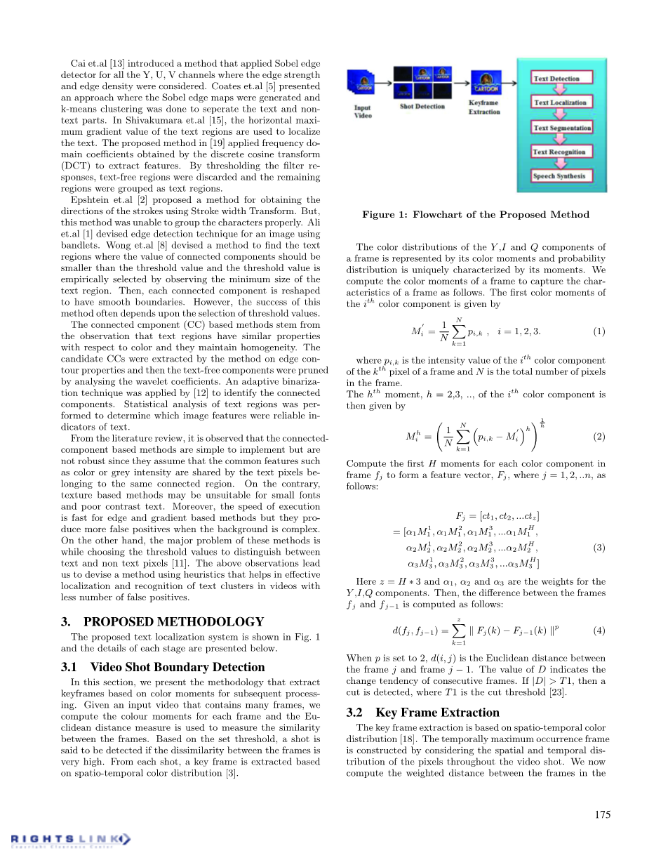 Cai等人[13]介绍了一种对所有Y、U、V通道应用Sobel边缘检测器的方法,该方法考虑了边缘强度和边缘密度。Coates等人[5]提出了一种生成Sobel边缘映射并进行k-均值聚类的方法来分离文本和非文本部分。在Shivakumara等人[15]中,文本区域的水平最大梯度值用于文本本地化。文[19]中提出的方法得到的频域系数通过离散余弦变换(DCT)来进行特征提取。通过阈值化过滤器响应,空余文本区域被丢弃并将剩下的区域被分组作为文本区域。Epshtein等人[2]提出了一种利用笔划宽度变换获得笔划方向的方法。但是,此方法不能正确地对分组这些字符。Ali等人[1]设计了一种使用带的图像边缘检测技术。Wong等人[8]设计了一种方法,通过观察文本区域的最小尺寸,找出连接组件的值应小于阈值的文本区域,并根据经验选择阈值。然后每个连接的组件都被改造为具有平滑的边界。然而,这种方法的成功往往取决于阈值的选择。基于连通分量(CC)的方法来自于对文本区域在颜色方面具有相似性质并且保持一致性。候选CCs被提取通过关于边缘轮廓特性的方法,然后通过对小波系数的分析对无文本分量进行修剪。[12]应用了一种自适应二值化技术来识别连接的组件。对文本区域进行统计分析,以确定哪些图像特征是文本的可靠指标。从文献综述中可以看出,基于连通分量的方法实现简单,但不具有鲁棒性,因为它们假设属于同一连通区域的文本像素共享颜色或灰度等公共特征。相反,基于纹理的方法可能不适合小字体和低对比度文本。此外,基于边缘和梯度的方法执行速度很快,但在背景复杂的情况下会产生更多的误报。另一方面,这些方法的主要问题是在选择阈值以区分文本像素和非文本像素时[11]。上述观察结果使我们设计出一种使用启发式的方法,该方法有助于在误报次数较少的视频中有效地定位和识别文本簇。