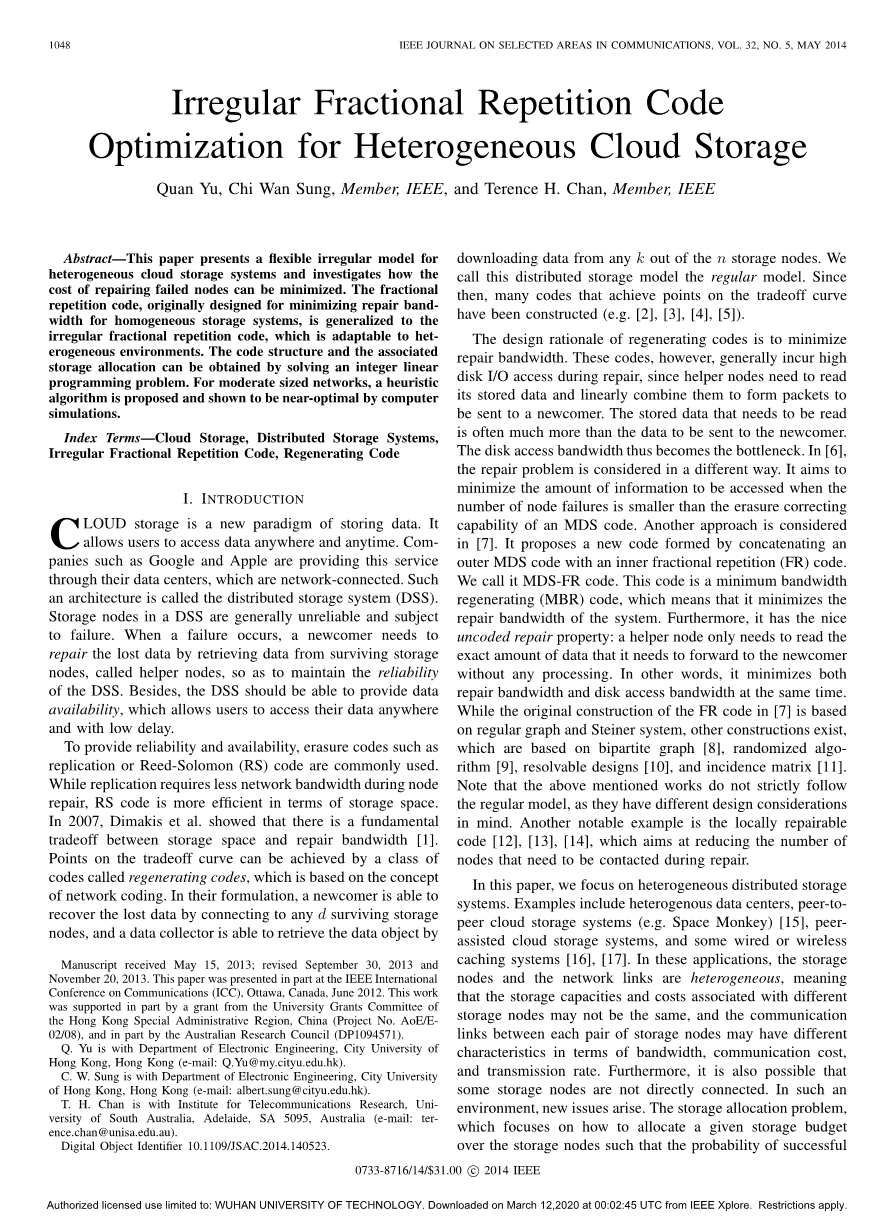 回想一下,文献[7]中使用的码是外部MDS码和内部FR码的级联。我们称这种结构为MDS-FR码。我们扩展了这个概念,并使用不规则分数重复(IFR)码作为内部码。虽然它保留了理想的未修复编码特性,但它进一步允许系统设计中更大的灵活性。当分布式存储系统和底层网络是异构的时,可以通过解决优化问题来构造IFR码并使其适应给定的环境,从而进一步减少修复带宽。在我们的公式中,我们通过正确选择MDS-IFR码来最小化系统修复成本。这个问题被证明是一个整数线性规划问题。当存储节点数量较少时,可以在合理的时间内找到最佳解决方案。对于较大的网络,我们将问题分解为子问题,并提出启发式解决方案。对于较小的网络规模,我们的启发式算法通过与最优ILP方法进行比较,显示出接近最优。