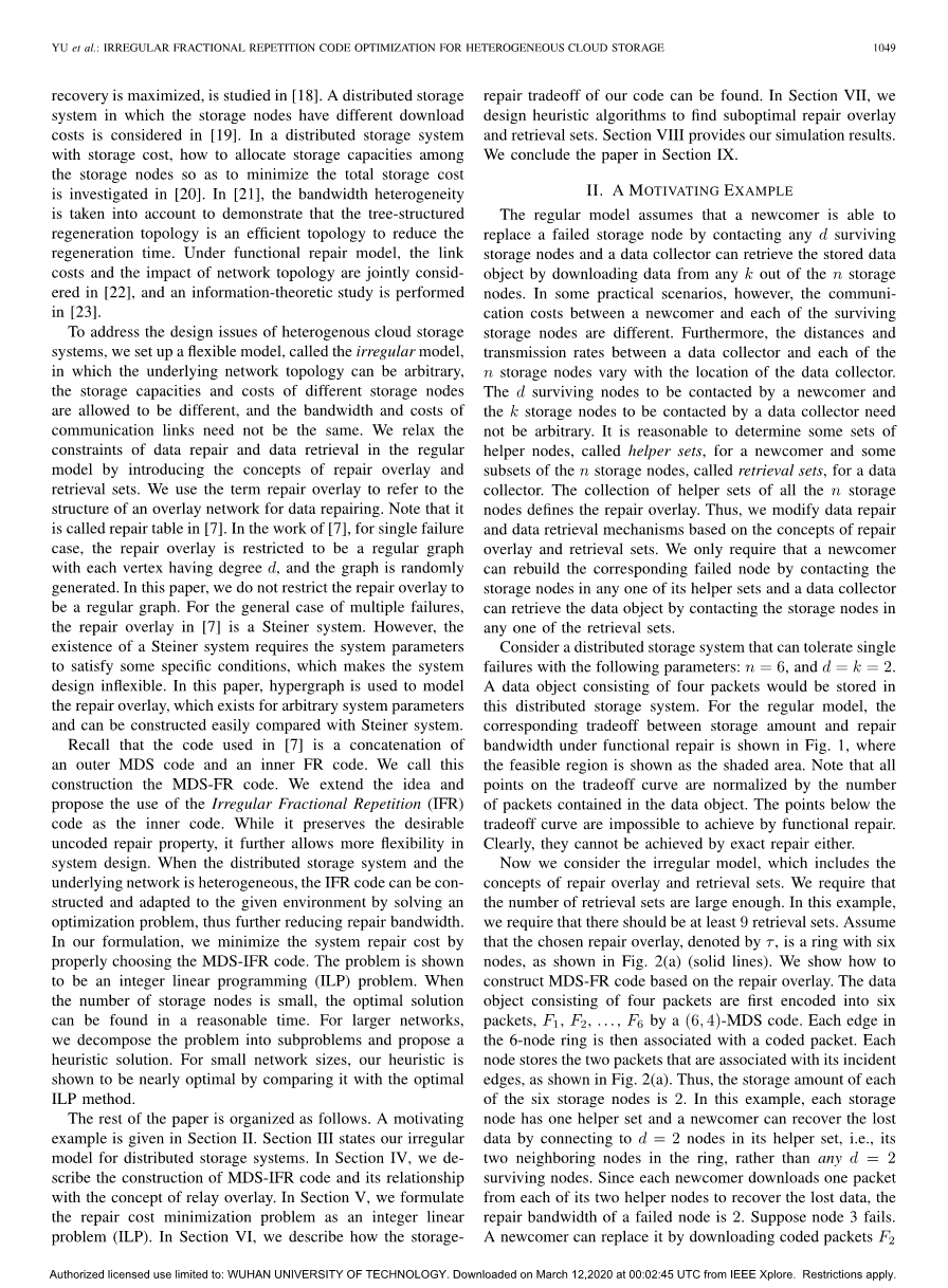 本文的其余部分组织如下。第二节给出了一个例子。第三节陈述了我们的分布式存储系统的不规则模型。在第四节中,我们描述了MDS-IFR码的构造及其与中继覆盖概念的关系。在第五节中,我们将维修成本最小化问题表述为整数线性问题。在第六节中,我们描述了如何找到码的存储修复折衷。在第七节中,我们设计启发式算法来寻找次优修复覆盖和检索集。第八节提供了我们的模拟结果。我们在第九节结束了论文。