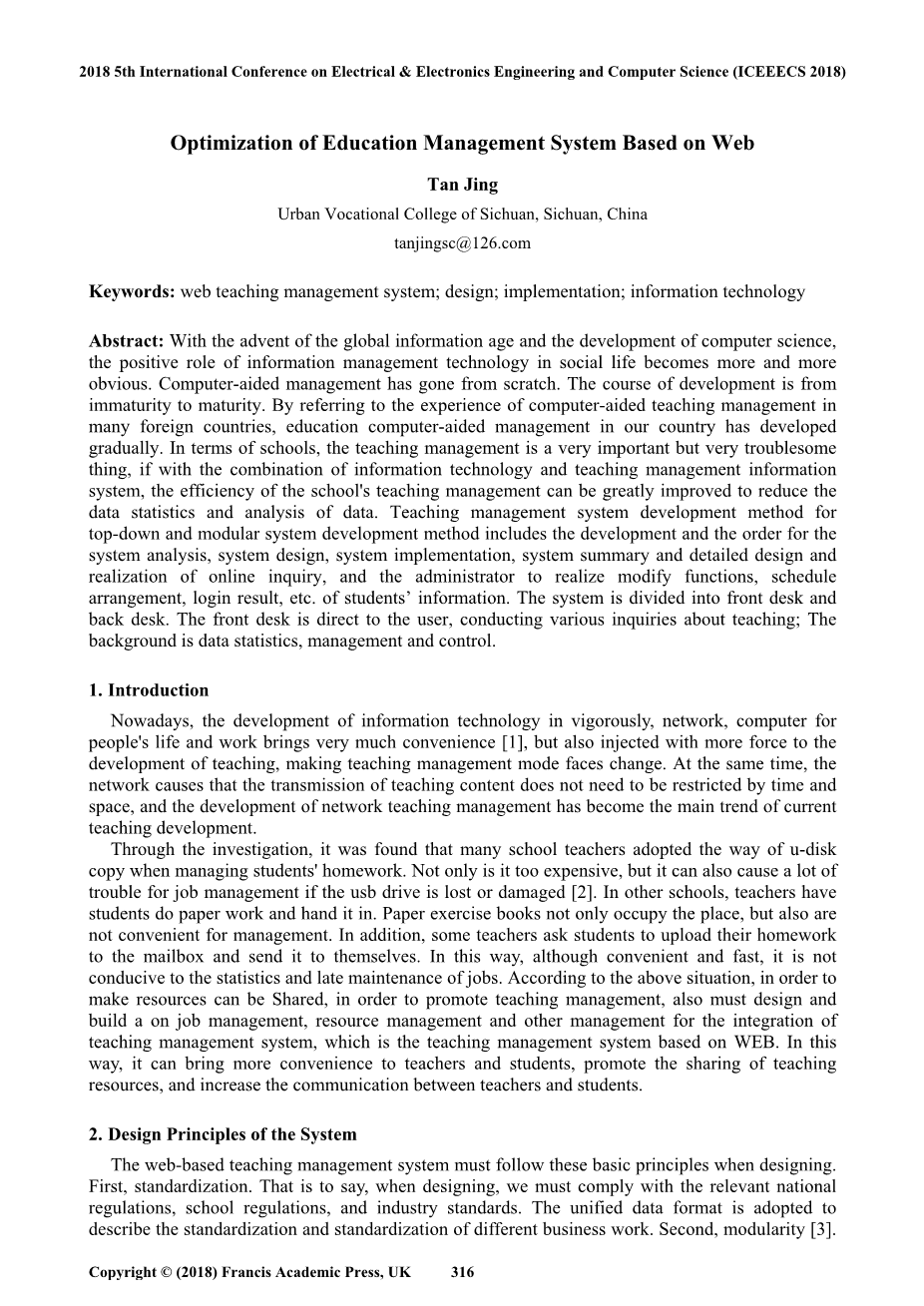[2] Jiang Y, Huang Z, Huang Z. Design and Implementation of a General Web-based Course Teaching Management System[C]// Third International Workshop on Education Technology and Computer Science. IEEE Computer Society, 2011:221-224.