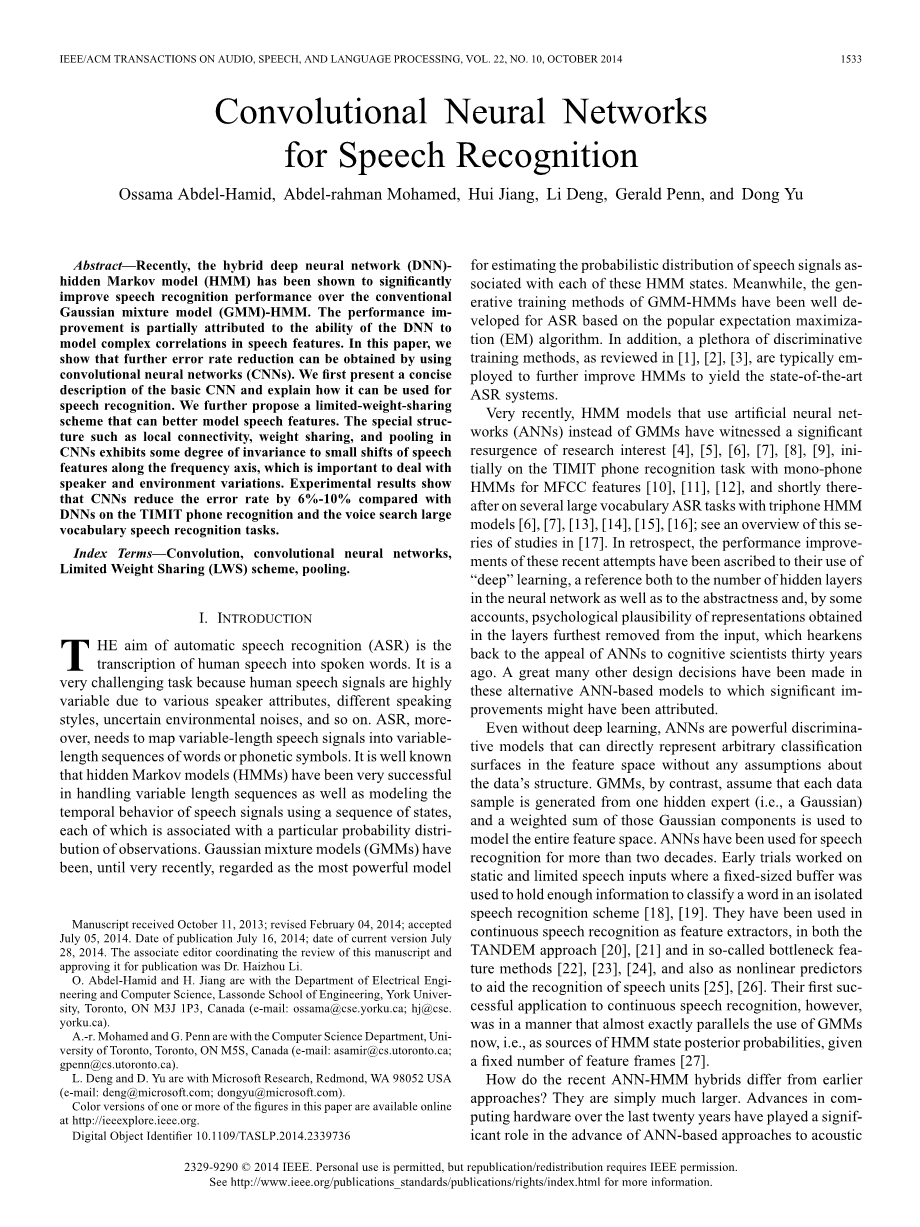 Ossama Abdel-Hamid, Abdel-rahman Mohamed, Hui Jiang, Li Deng, Gerald Penn, and Dong Yu
