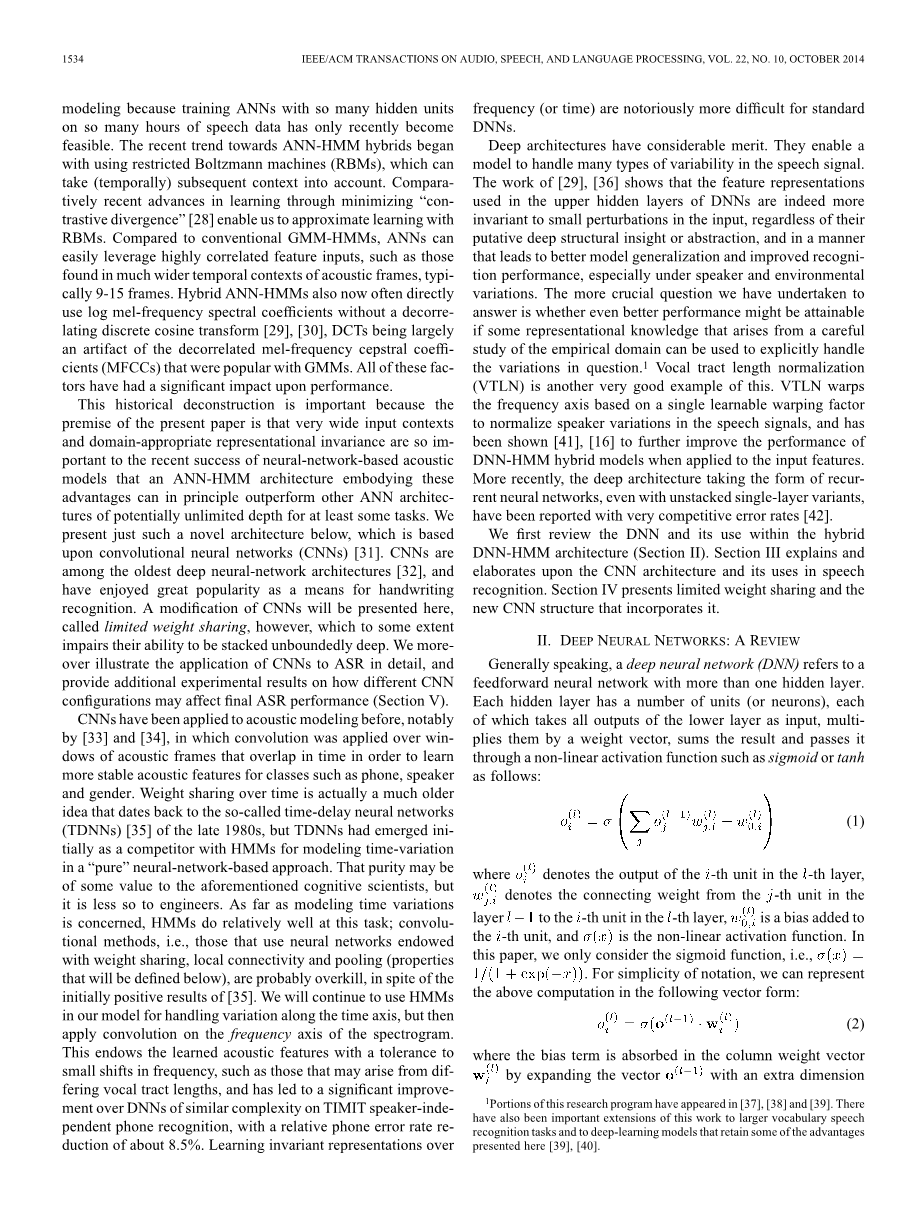 这一历史解构是很重要的,因为本文的前提是:广泛的输入环境以及域合适的代表不变性都对近期基于神经网络的声学模型的成功起到重要作用,这个声学模型由ANN-HMM架构体现优势,可以在大体上胜过其他的ANN架构(至少对于一些任务存在潜在无限深度)。我们仅仅是在下面提出一个新的以卷积神经网络CNNs为基础的架构。CNNs在最古老的深层神经网络架构中,一直都很普及地被作为一种笔迹识别的方法。一个改进过的CNNs将会在后面被提出,称之为限权共享,然而这种在某种程度上削弱了它们自身深入无限制堆叠的能力。而且,我们会仔细说明CNNs对于ASR的应用,并且提供附加的实验(不同的CNN结构会怎样影响最终的ASR性能(第五部分))结果。