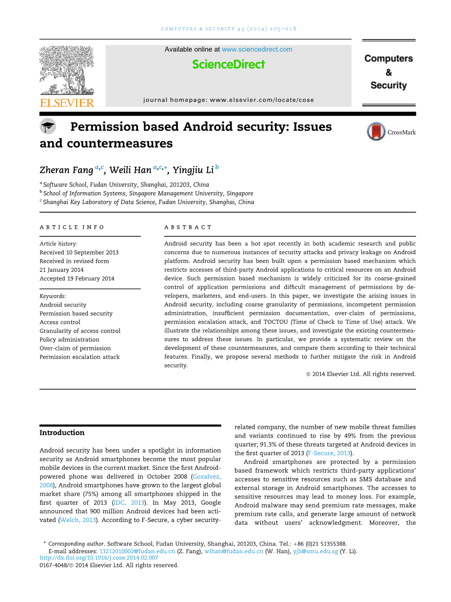 由于在安卓平台上大量的安全攻击和隐私泄漏,安卓系统的安全一直是学术研究和公众关注的热点。安卓安全性建立在一个在安卓设备上限制第三方安卓应用程序对安卓系统的关键资源的访问的权限机制。这些权限机制由于它的应用权限的不好控制和开发者,市场营销热源和终端用户的权限难以管理而被广泛批评。在本文中,我们调查了安卓系统安全所产生的问题,包括权限的粗粒度,不合适的权限管理,权限不足的文件,超过要求的权限,权限升级攻击和TOCTOU(检查时间使用的时间)攻击。我们阐述了这些问题之间的关系,并且研究了解决这些问题存在的措施。特别地,我们提供了对这些对策应用的一个系统的审查,并比较它们之间的技术特征。最后,我们提出了几种方法,以进一步减轻安卓系统化安全的风险。