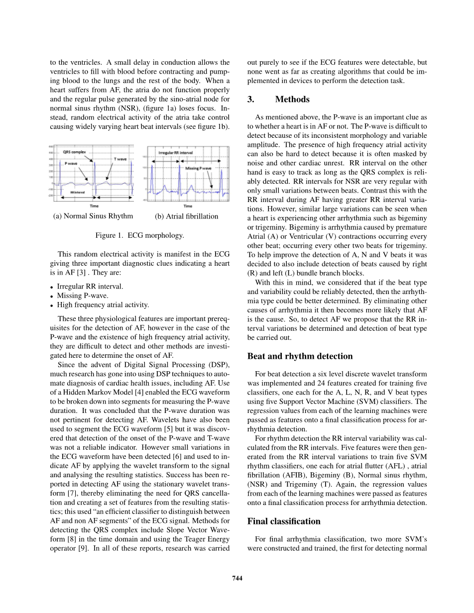 然而,当心脏正在经受其他心律失常如二联或三联时也会出现类似的大变化。二联由房性早搏引起的心律失常(一)或心室(V)收缩每隔一拍发生;三联引起每隔两拍的发生。为了帮助提高对A心脏跳动的检测,N和V节拍也被包括在了检测的跳动中,因为 (左)和左(升)束支阻滞。基于此我们认为,如果节拍型和多样性可以被可靠地检测到,则心律失常类型可以更好地确定。通过排除其他的心律失常的原因,确定它就是房颤的原因。因此,我们提出检测AF的RR间期的变化是可以通过确定节拍的类型 。