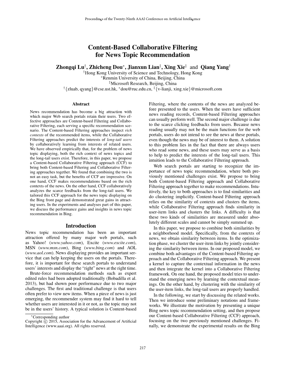 接下来,我们将从相关的工作开始讨论。然后介绍了一些初步的符号标识和框架。我们通过展示一个独特的Bing新闻主题推荐设置来说明其动机,然后提出我们基于内容的协同过滤(CCF)方法,关注前面提到的两个挑战。最后,我们展示了Bing门户上的实验结果,并讨论了我们对该应用程序的见解。